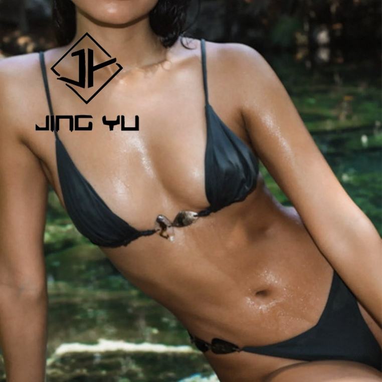 ชุดว่ายน้ำบิกินี่สองชิ้นแบบสายสปาเก็ตตี้ ทำจากไนลอนรีไซเคิลสั่งทำพิเศษ พร้อมเครื่องประดับเปลือกหอยสุดหรูสไตล์ฮาวายจาก OEM