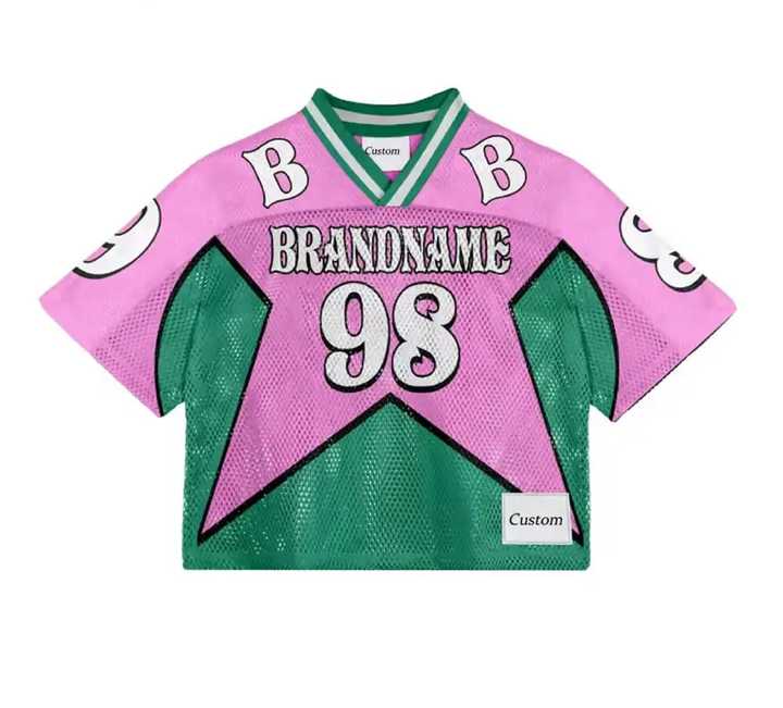 เสื้อเจอร์ซีย์อเมริกันฟุตบอลทรงบ็อกซี่ฟิตแบบครอปพอดีตัว ผ้าตาข่ายเนื้อหนา OEM ออกแบบลายดิจิทัลตามสั่ง ระบายอากาศได้ดี ผลิตจากโพลีเอสเตอร์ 100%