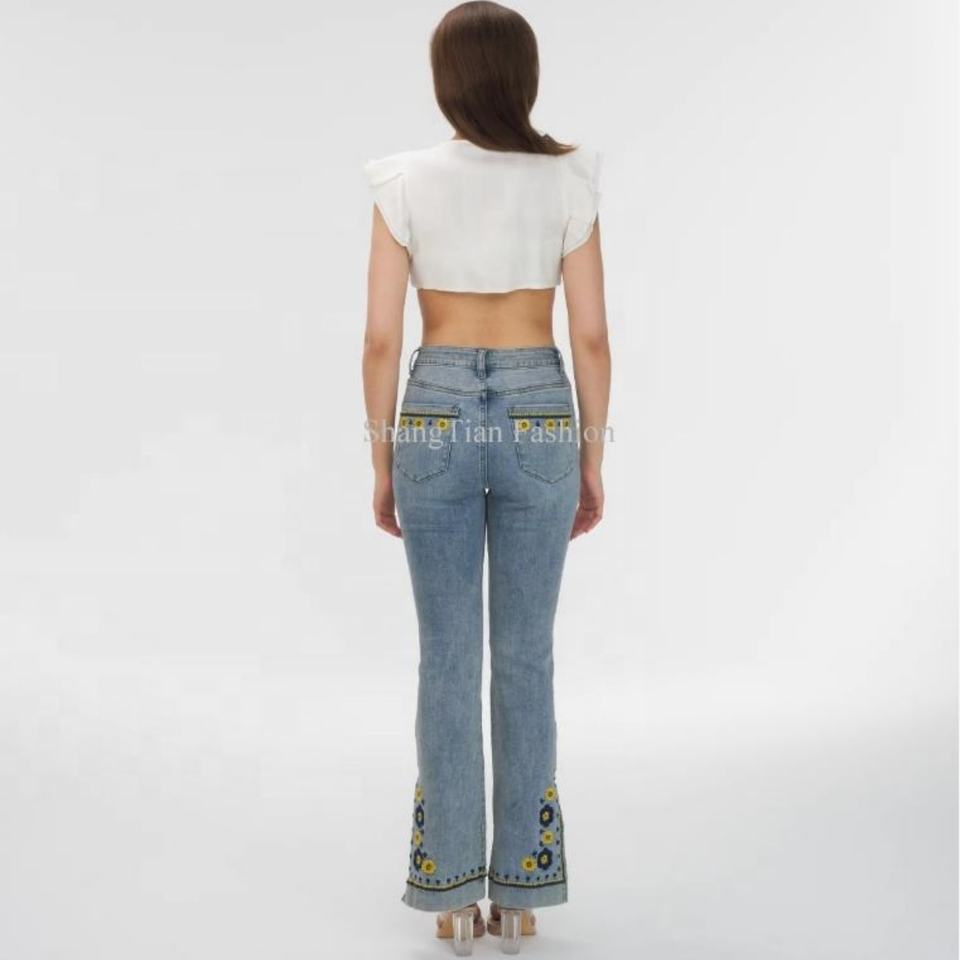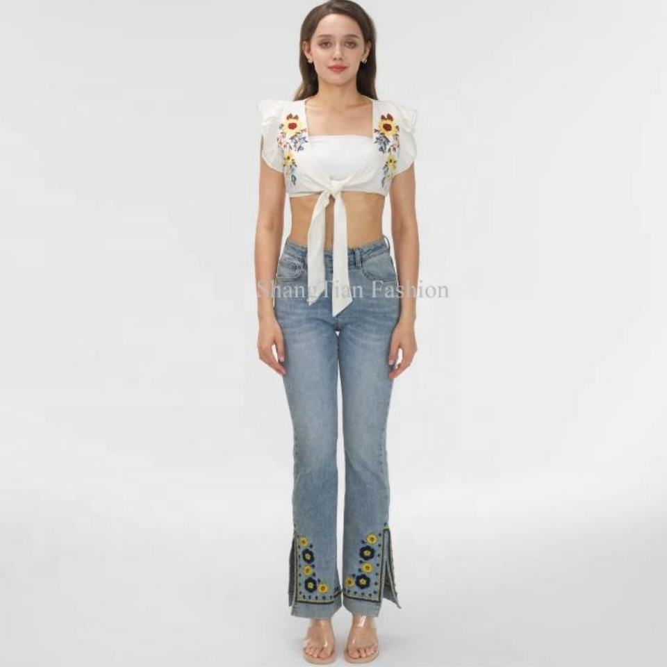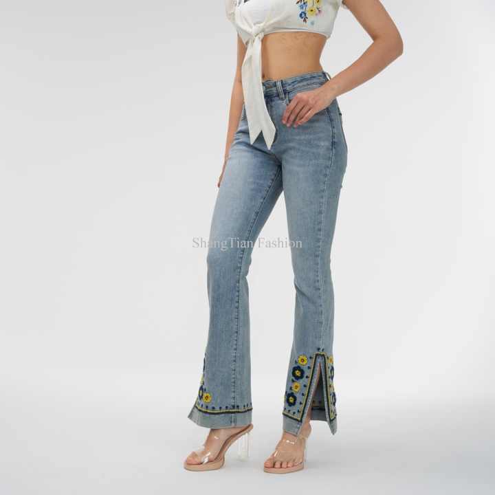 OEM High Fashion Traditional Light Blue Women Pants Slit Hem Ladies Embroidery Pattern Flower Stretchy Flared Denim Jeans