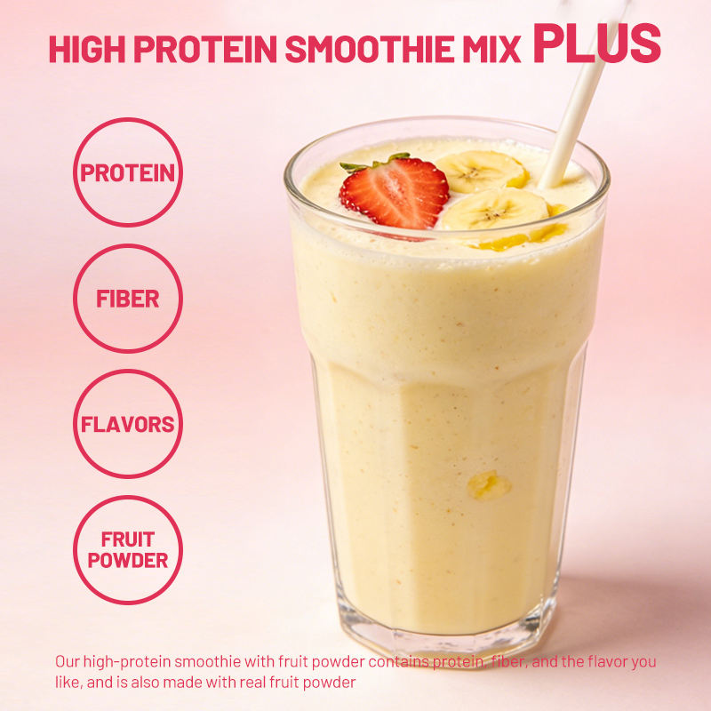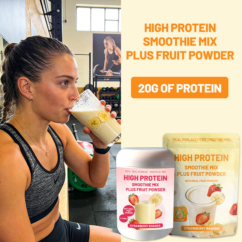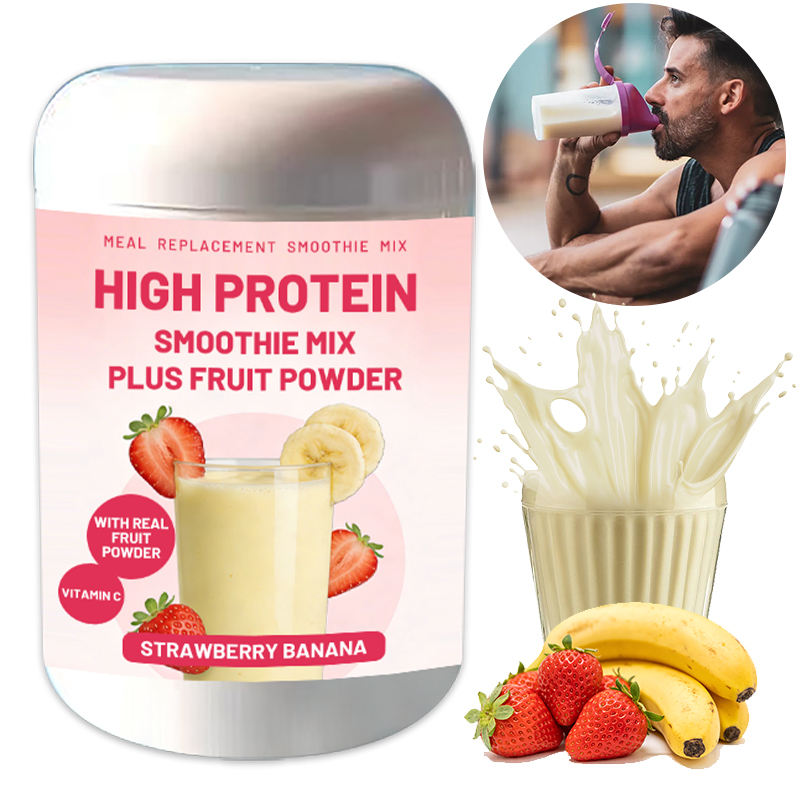 ผงโปรตีนสูง OEM สูตรสมูทตี้รสสตรอว์เบอร์รีกล้วย ผสมผงผลไม้ โปรตีน 20 กรัม