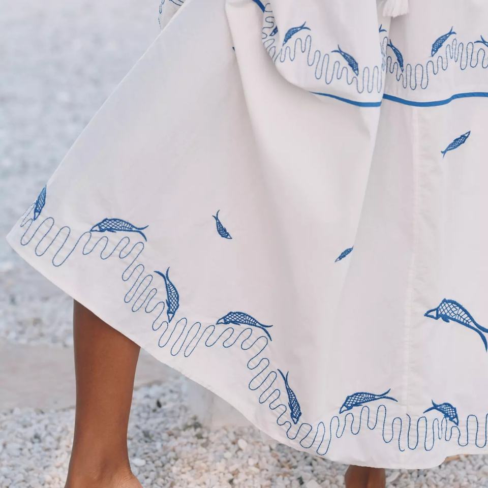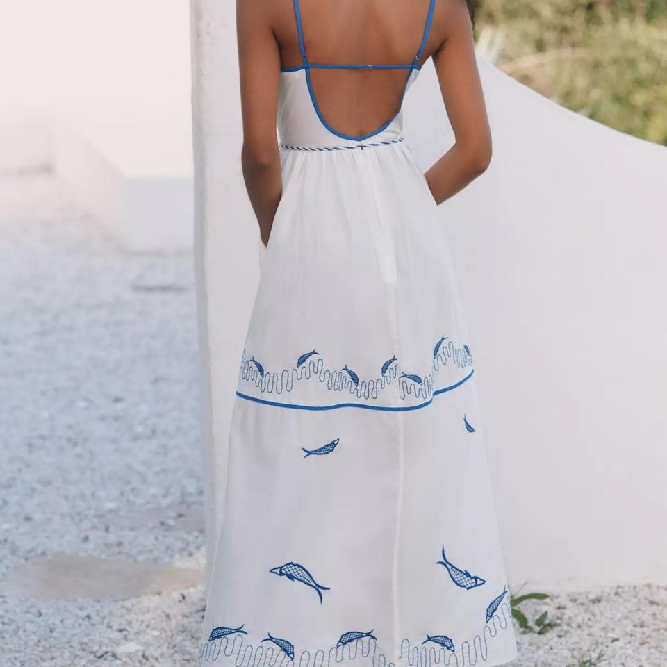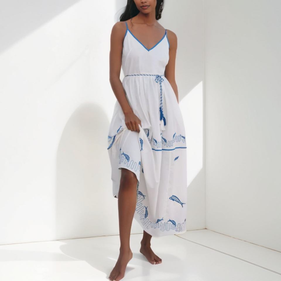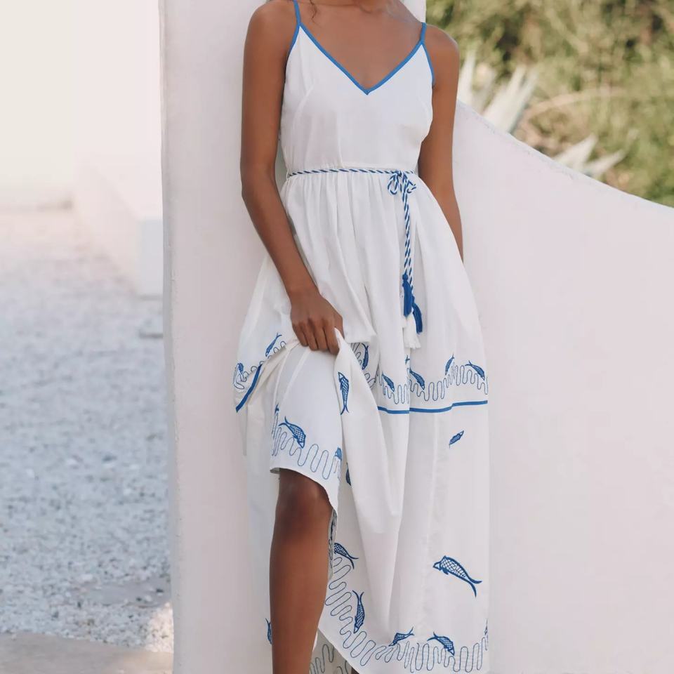 เดรสยาวปักลายผ้าฝ้ายแท้ 100% คุณภาพสูงแบบ OEM ทรงเปิดไหล่ ไร้แขน สำหรับผู้หญิง