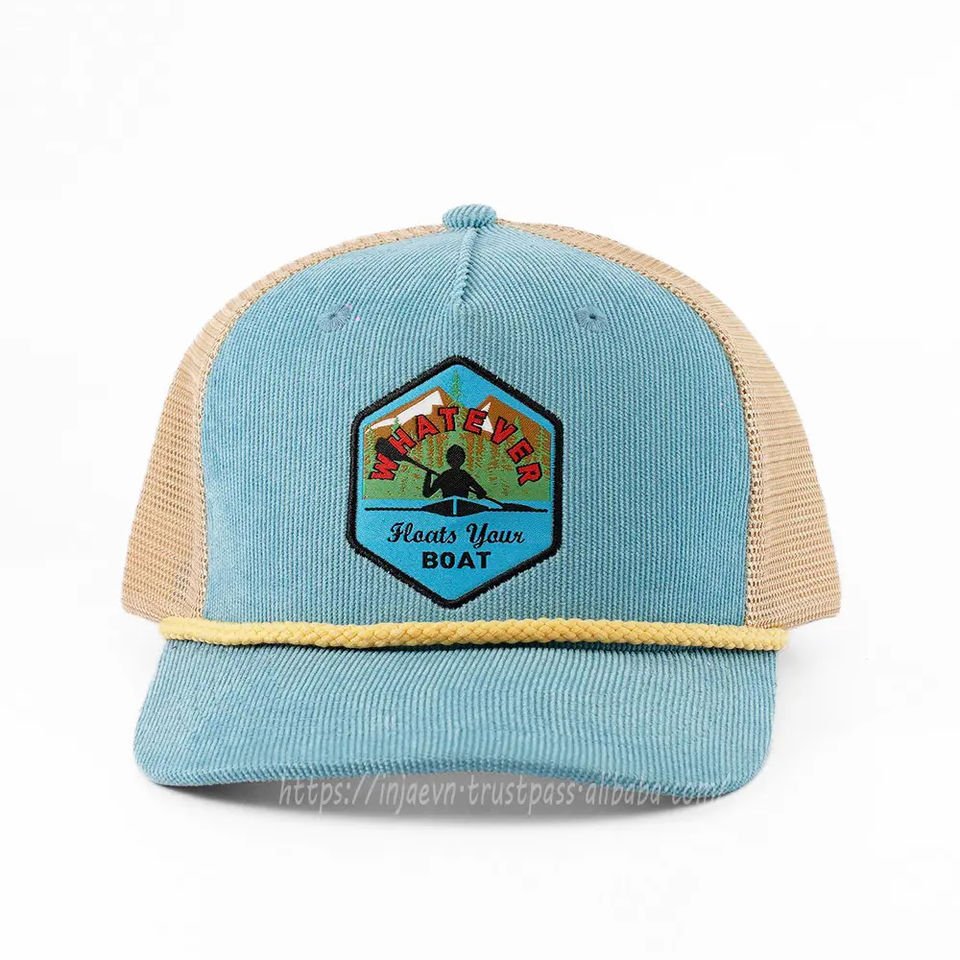 หมวกแก๊ปทรูเกอร์ผ้าตาข่าย5แผงสำหรับทุกเพศงานปักผ้าลูกฟูกพร้อมเชือกลูกฟูกหมวกทรูเกอร์3D ตามสั่ง