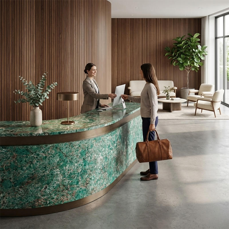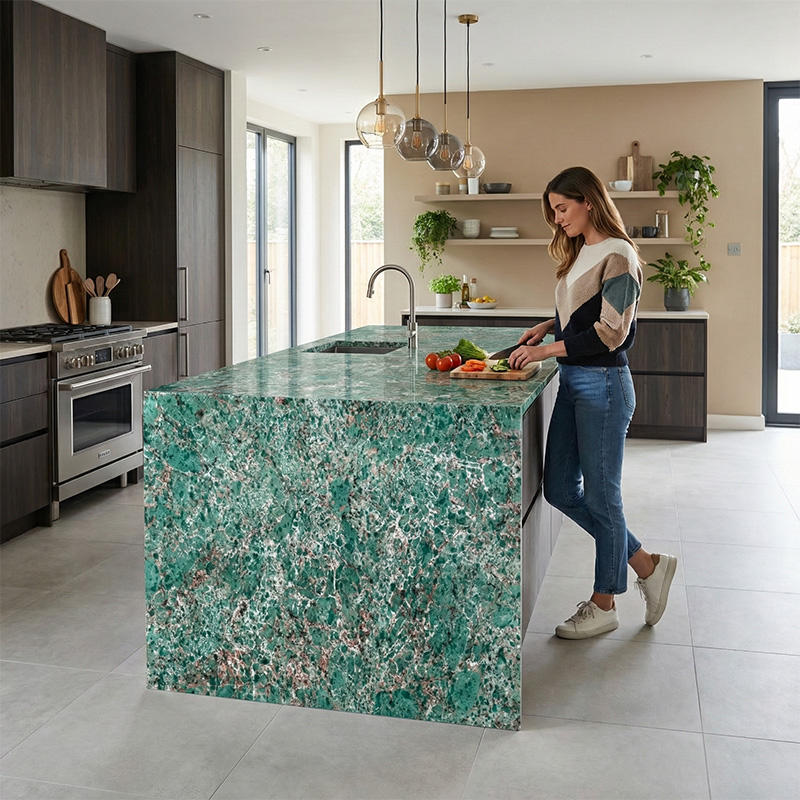 หินควอตซ์เทียมลายทิฟฟานี่กรีนคุณภาพสูงแบบไร้รอยต่อสำหรับท็อปโต๊ะอาหาร ท็อปเคาน์เตอร์ และท็อปโต๊ะต้อนรับ
