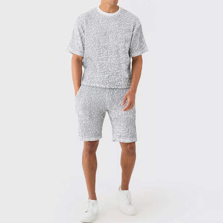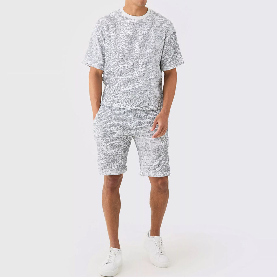 ชุดเซ็ตเสื้อยืดและกางเกงขาสั้นผู้ชายคุณภาพสูงแบบ OEM ผ้ากำมะหยี่ สวมใส่สบาย ระบายอากาศได้ดี แห้งเร็ว ลายพิมพ์สวยงาม เหมาะสำหรับฤดูร้อน