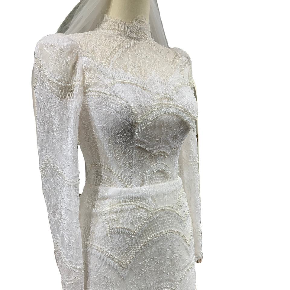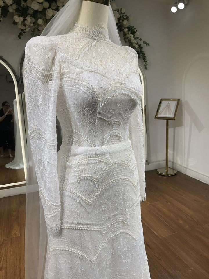 OEM ชุดเดรสแต่งงานนางเงือกงานแฮนด์เมดประดับด้วยลูกปัดหางยาวตกแต่งดอกไม้สไตล์ทันสมัยขายส่งโดย TNBPno69