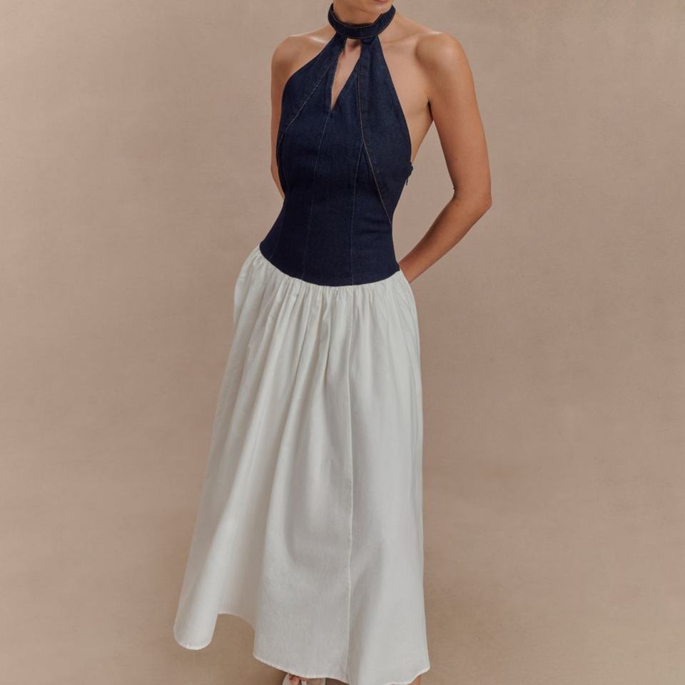 ชุดเดรสยาวแบบเปิดหลัง ดีไซน์เก๋ไก๋ สีสันตัดต่อ คอวีลึก สายคล้องคอ สไตล์ลำลอง คุณภาพสูงจากโรงงานผู้ผลิต (OEM) เหมาะสำหรับฤดูร้อน