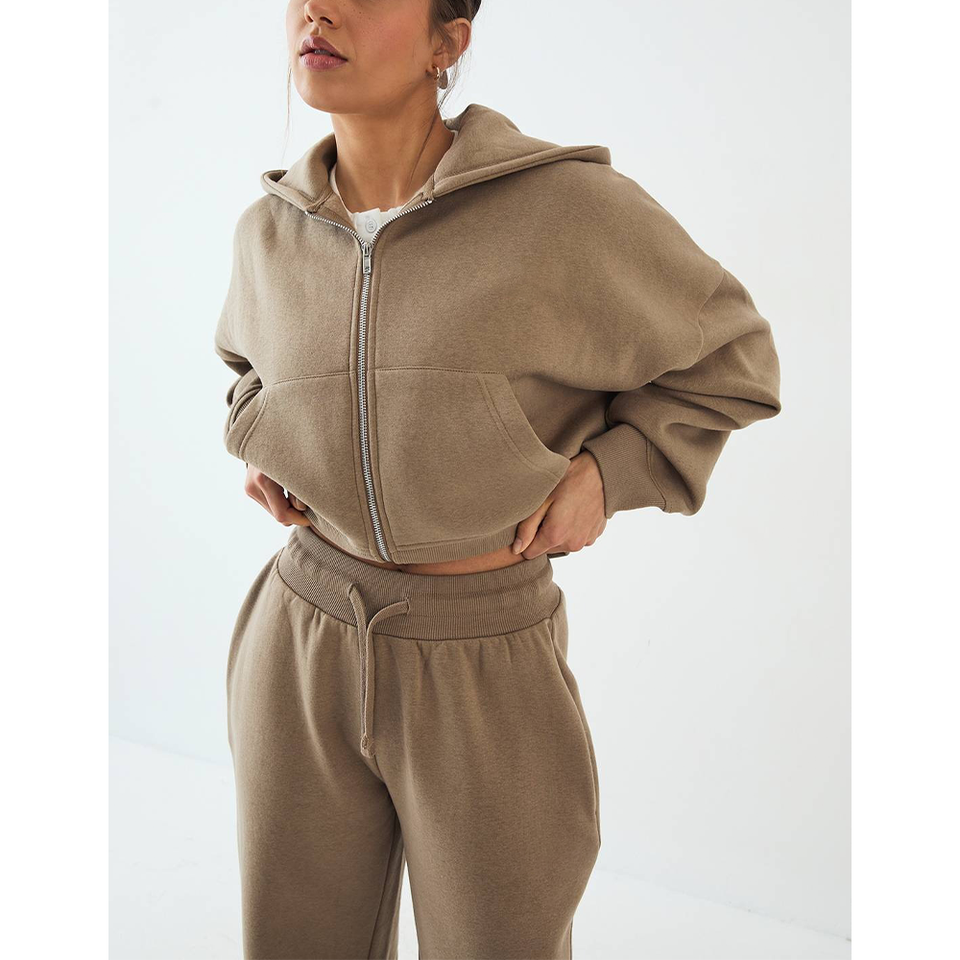 ชุดจ็อกเกอร์เอวสูงผ้าเฟรนช์เทอร์รี่ OEM แบบแห้งเร็ว ระบายอากาศได้ดี พร้อมเสื้อฮู้ดทรงบ็อกซี่และกางเกงขายาวรัดเชือก ชุดวอร์มกีฬา