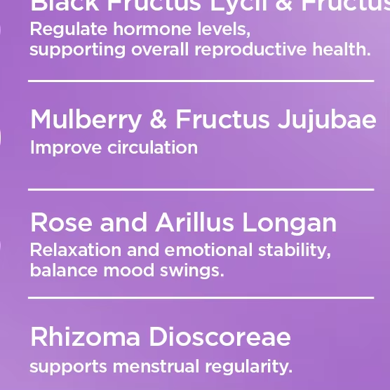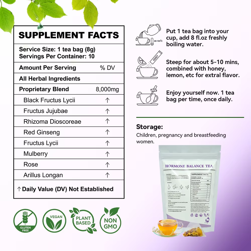 ชาสมุนไพรปรับสมดุลฮอร์โมน OEM ผสมโกจิเบอร์รี่ดำ โสมแดง รากมันเทศ และกุหลาบ - ธรรมชาติ 100% มังสวิรัติ ปราศจาก GMO บรรจุ 10 ซองชาต่อกล่อง (ซองละ 8 กรัม)