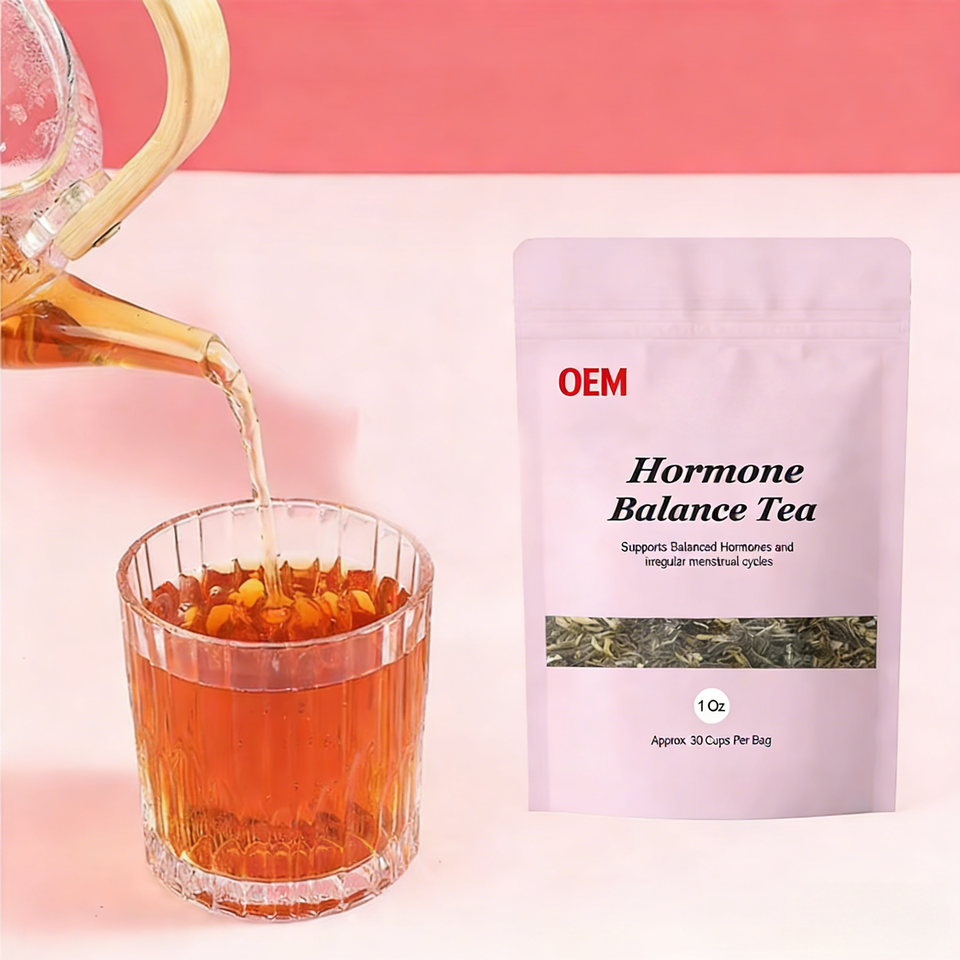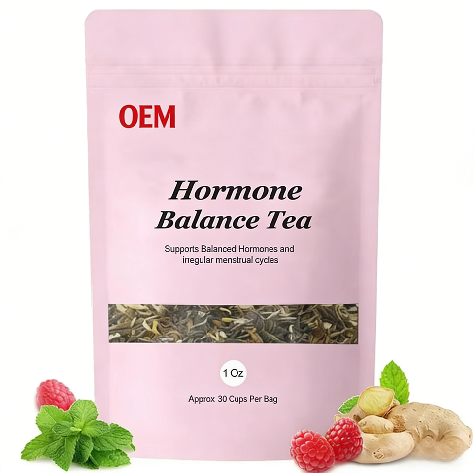 ชาสมุนไพรผสมสูตร OEM สำหรับปรับสมดุลฮอร์โมน ช่วยบรรเทาอาการประจำเดือน 100% ออร์แกนิค ใบราสเบอร์รี่แดง ใบตำแย ขิง บรรจุถุงชา 10 ออนซ์