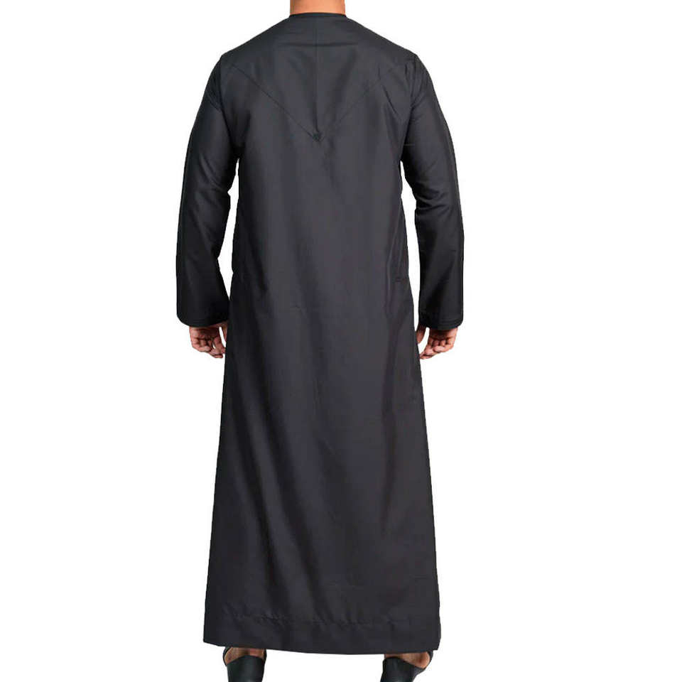เสื้อคลุมอิสลามแขนยาวสำหรับผู้ชาย ขายดีแบบ OEM สีดำ สไตล์อาหรับ ซาอุดิอาระเบีย ดัฟฟาห์ ดูไบ คูเวต ระบายอากาศได้ดี