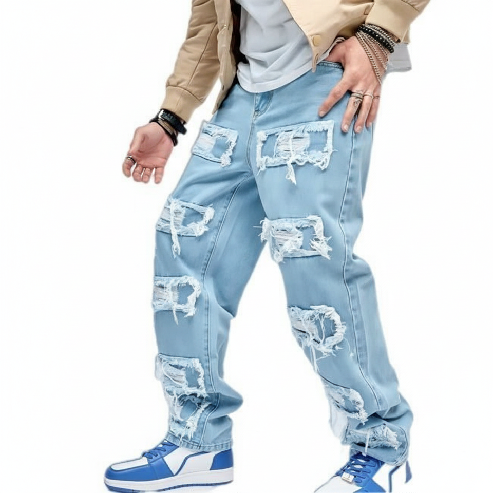 กางเกงยีนส์สไตล์ฮิปฮอปสำหรับผู้ชายกางเกงยีนส์สไตล์ฮิปฮอปสีฟ้าสไตล์ใหม่