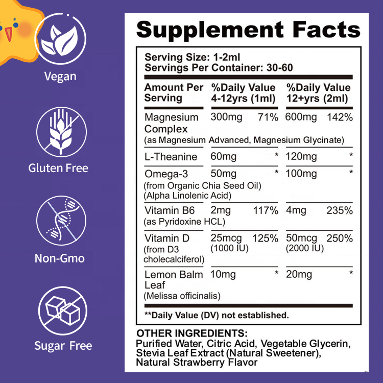 โออีเอ็ม คิดส์ แมกนีเซียม คอมเพล็กซ์ ดรอปส์ ผสมแอล-ธีอะนีน โอเมก้า-3 วิตามินบี6 และดี ช่วยผ่อนคลายและเสริมการนอนหลับ อาหารเสริมสำหรับเด็ก