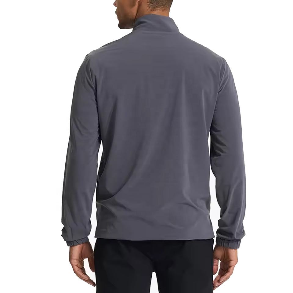 ชุดฝึกซ้อมสองชิ้นแบบมีปกตั้งเคลือบผิวน้ำหนักเบา OEM พร้อมป้ายยี่ห้อสั่งทำ เสื้อแจ็คเก็ตกันลมชั้นเดียว MOQ ต่ำ