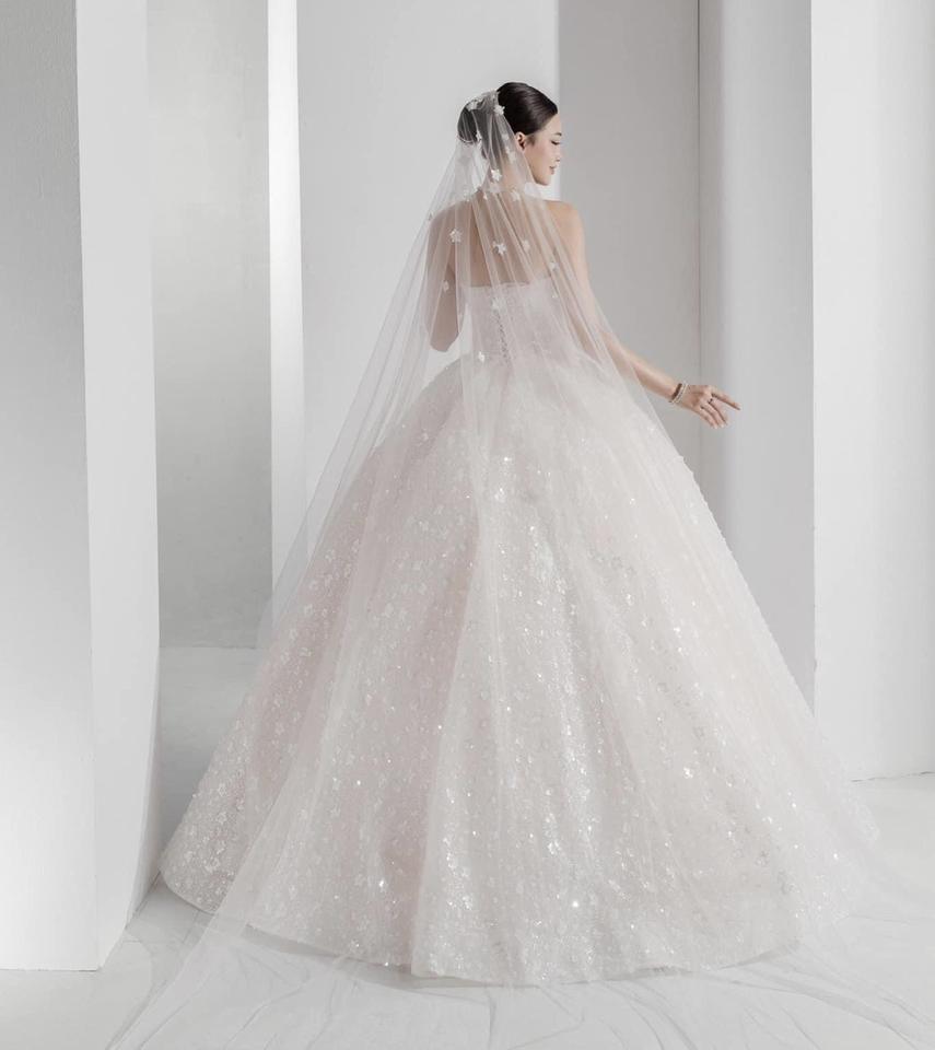 รับผลิตชุดแต่งงานคุณภาพสูง ดีไซน์ทรงบอลกาวน์ แต่งลูกไม้ดอกไม้ หางยาว ประดับด้วยลูกปัด รุ่น TNBPno74