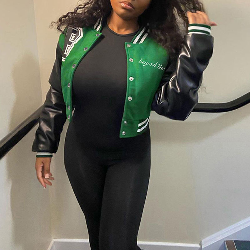 เสื้อแจ็คเก็ตเบสบอลแบบครอปสำหรับผู้หญิง แบรนด์ OEM ผลิตจากผ้าเชนิลล์ปักลายหนัง พิมพ์ลายสตรีทแวร์ พร้อมปักโลโก้ตามสั่ง