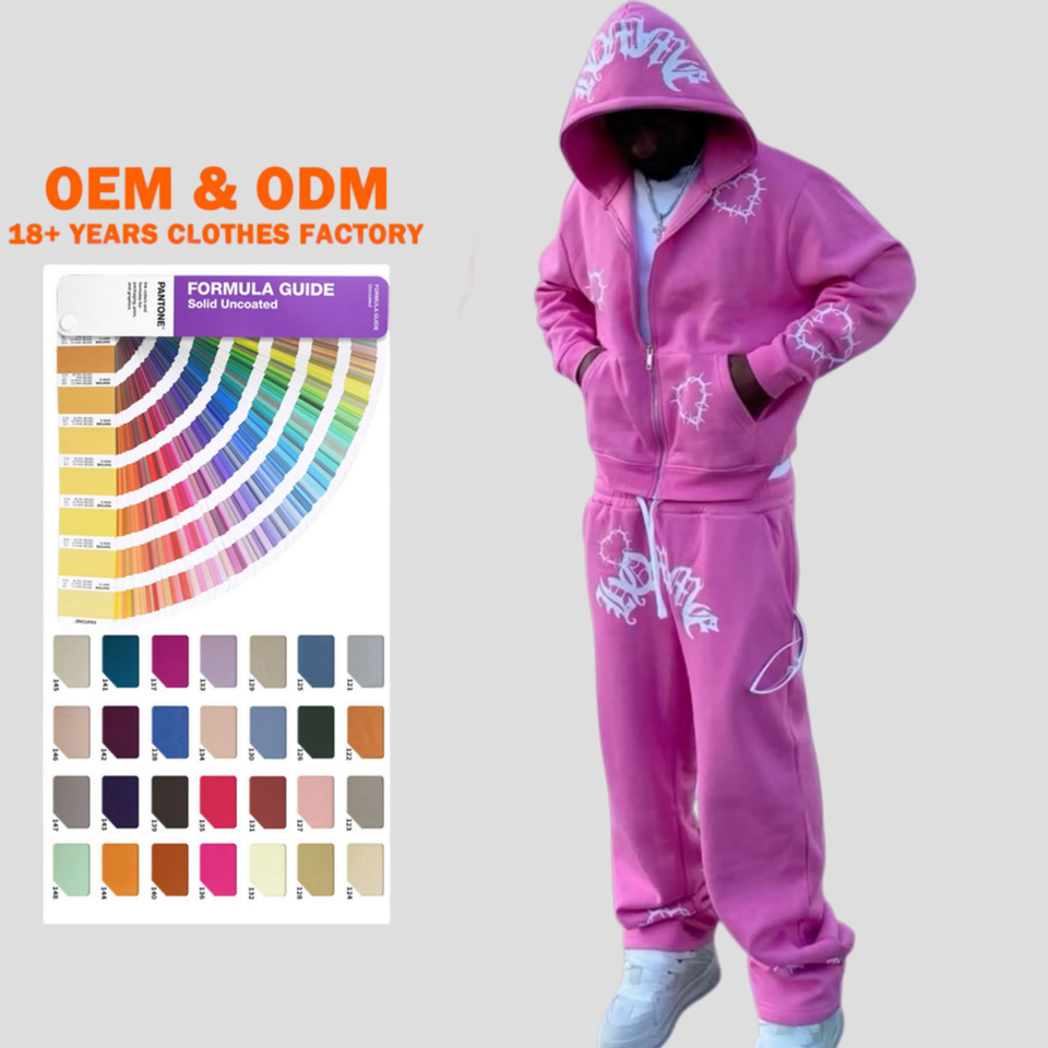 ชุดสเวตสูทแบบโอเวอร์ไซส์สไตล์สตรีทแวร์ ลวดลายย้อมสีแบบแอซิดวอช พร้อมเสื้อฮู้ดปักโลโก้ตามสั่งจากผู้ผลิต OEM และกางเกงขายาวทรงบาน