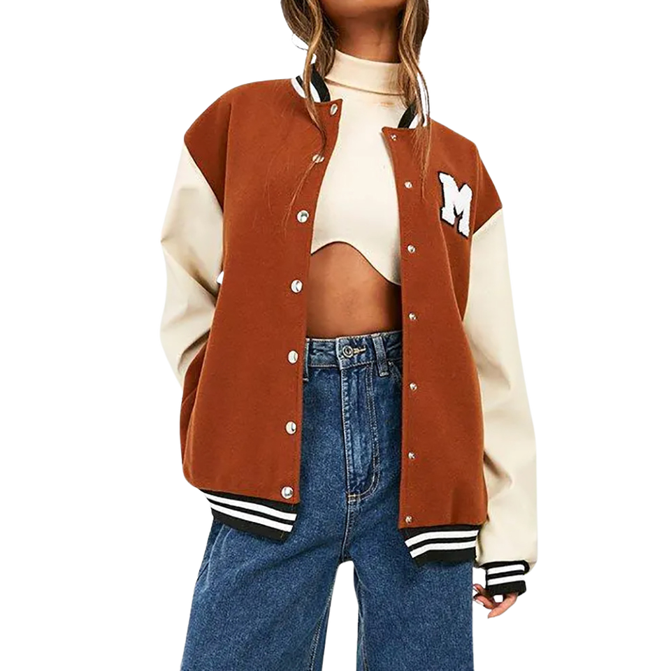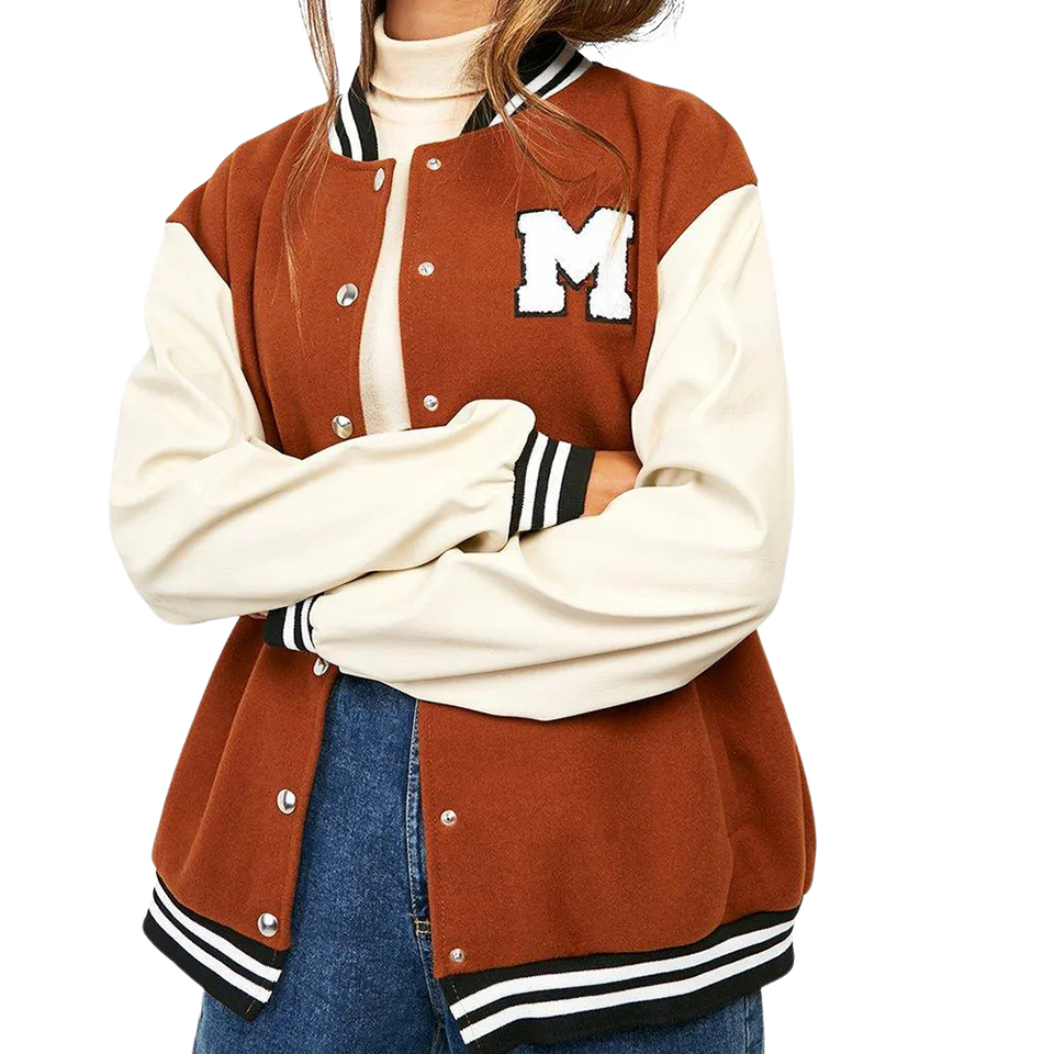 แจ็กเก็ตเบสบอลมหาวิทยาลัยเลตเทอร์แมนแขนเสื้อหนังปักโลโก้ได้ตามต้องการ