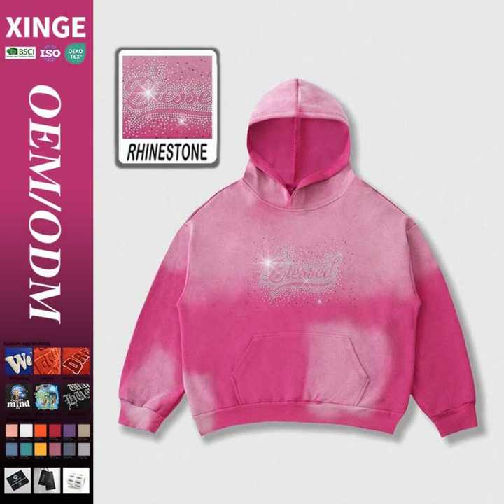 ผู้ผลิต OEM เสื้อฮู้ดดี้ทรงบ็อกซี่ พิมพ์ลายกราฟิกประดับเพชรเทียม สไตล์วินเทจ ลุคซักซีด ขาดๆ แบบโอเวอร์ไซส์ สำหรับผู้ชาย