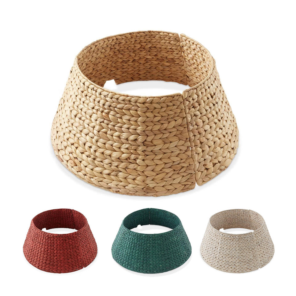 ผู้ผลิต OEM รับผลิตตามขนาดที่ต้องการ ผ้าคลุมฐานต้นไม้ทอจากผักตบชวา พร้อมช่องสำหรับเชือก ผ้าคลุมฐานต้นคริสต์มาสแบบธรรมชาติ ขายส่ง