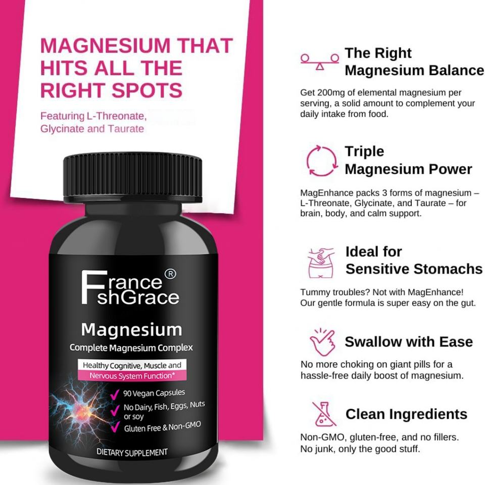 อาหารเสริมแมกนีเซียมคอมเพล็กซ์จากผู้ผลิต OEM 90 แคปซูล ช่วยเสริมสร้างภูมิคุ้มกันเพื่อสุขภาพสำหรับผู้ใหญ่ สารสกัดแมกนีเซียมคอมเพล็กซ์