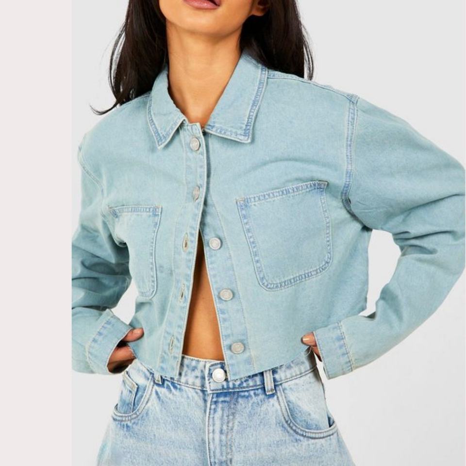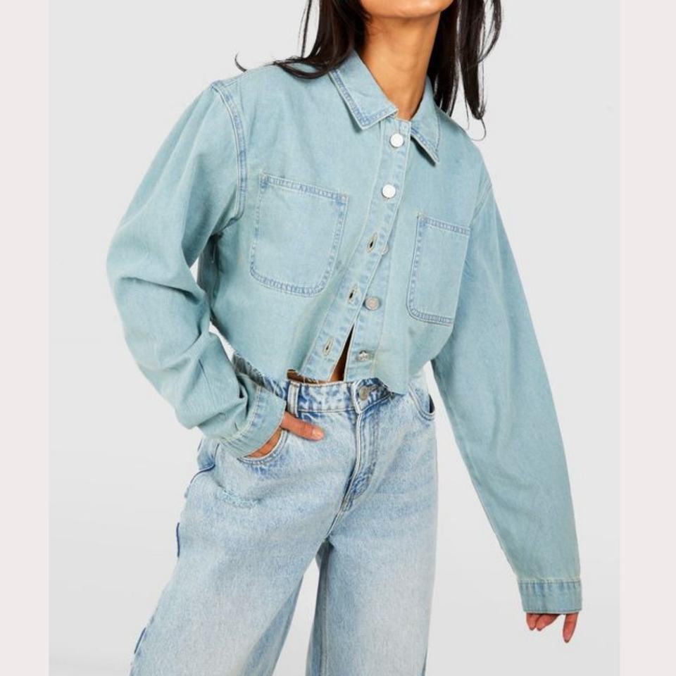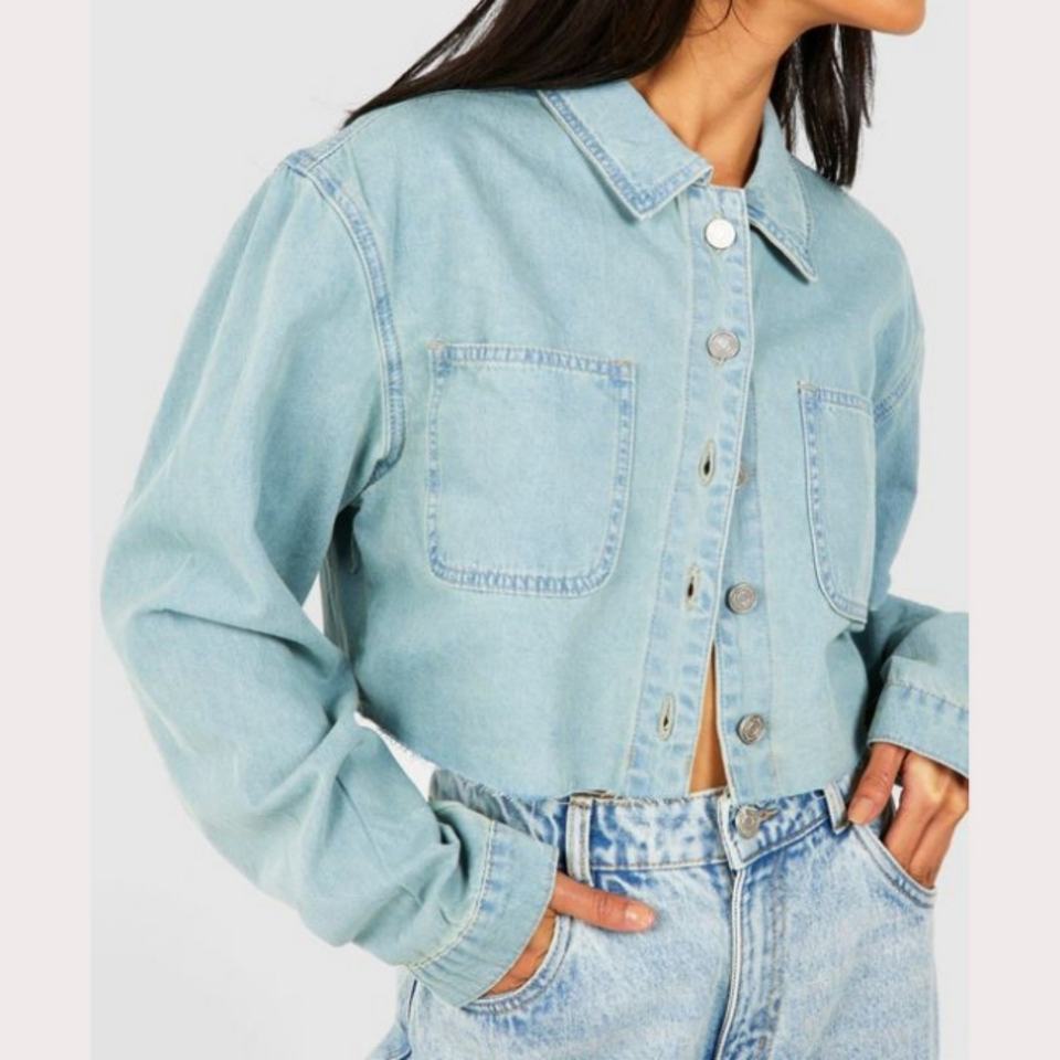 เสื้อเชิ้ตยีนส์พรีเมียมสำหรับผู้หญิงจากผู้ผลิต OEM ตกแต่งขอบดิบ ทรงครอป