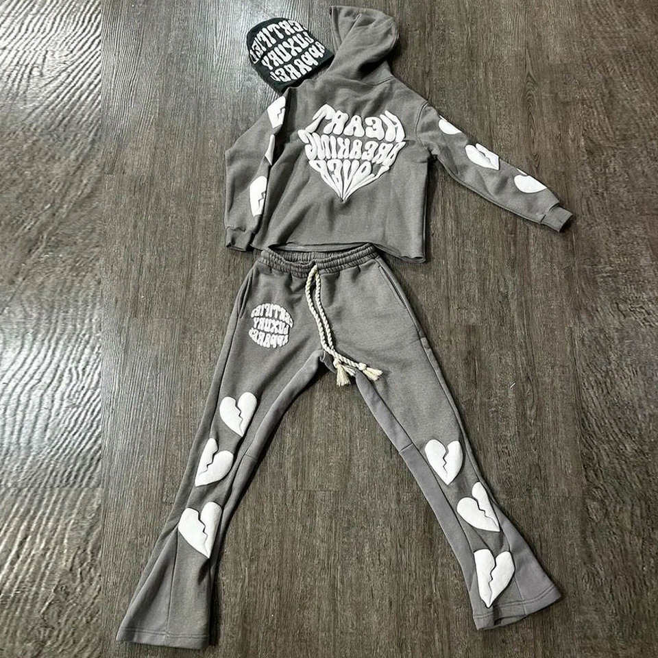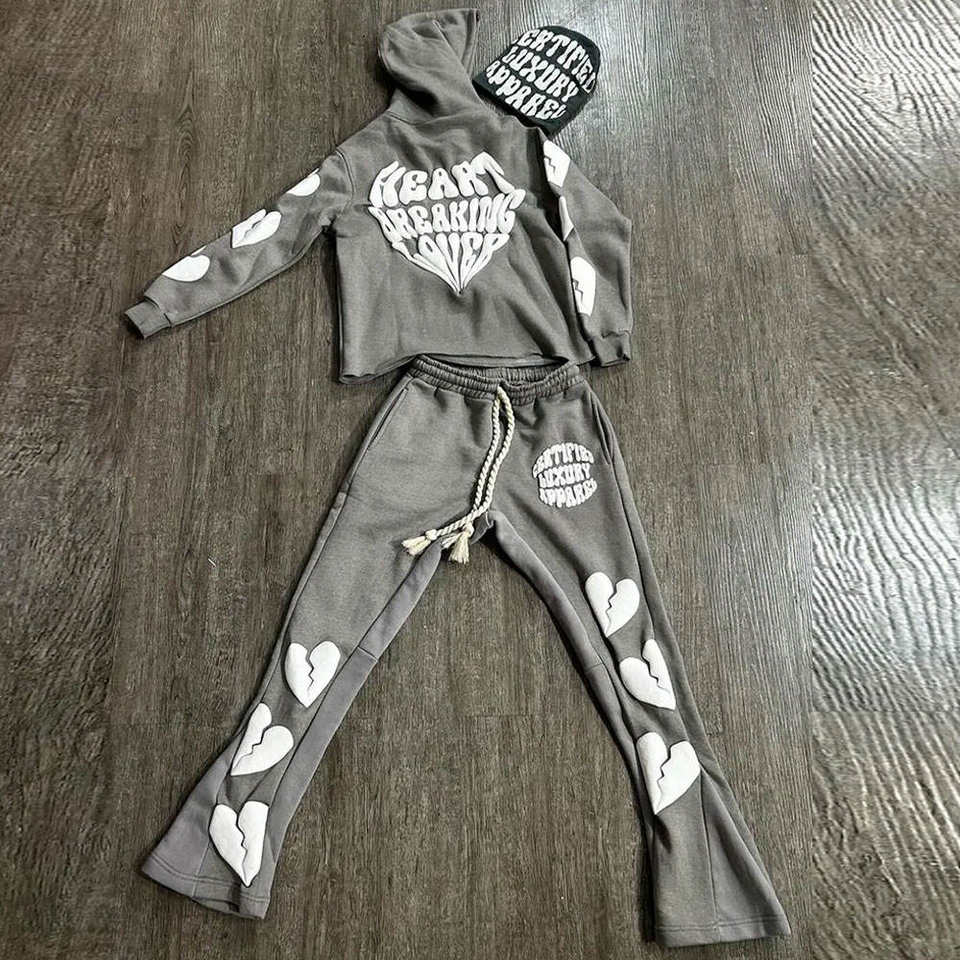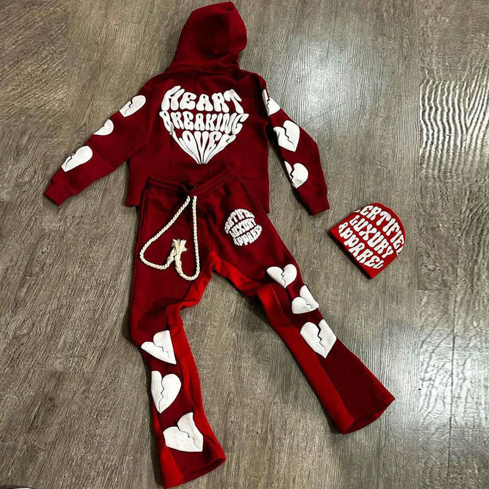 ชุดกีฬาผ้าฝ้ายพิมพ์ลายเฟรนช์เทอร์รี่พัฟชุดวอร์มและหมวกบีนนี่450แกรม