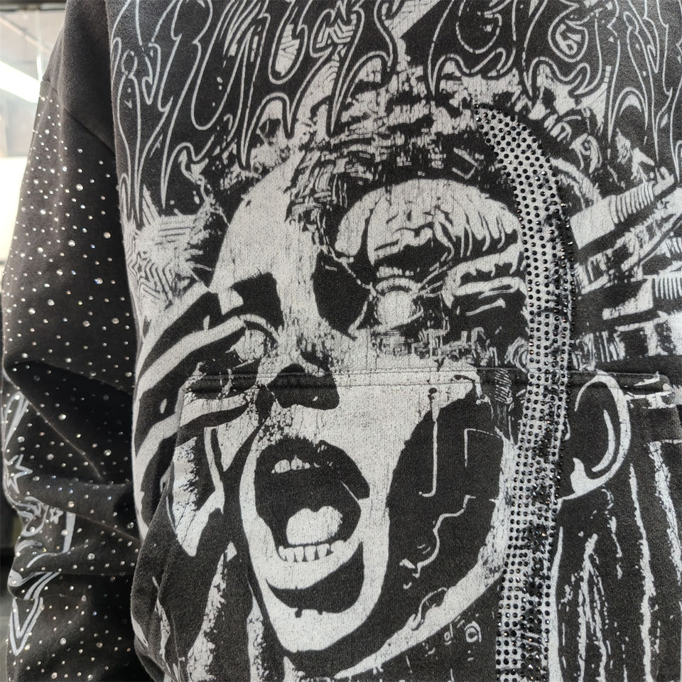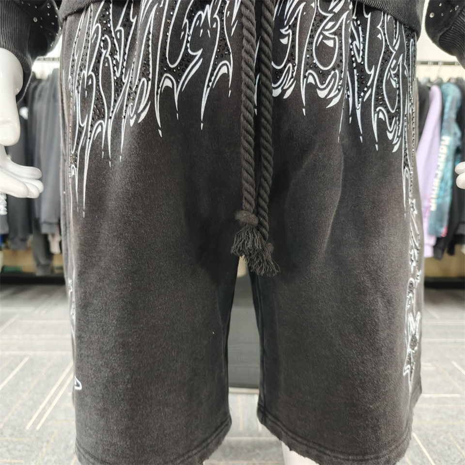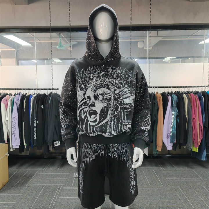 OEM Manufacturer Wholesale Two Piece Set Rhinestone Tracksuit Dtg Print Screen Print Drawstring Shorts and Hoodie Sets for Men
