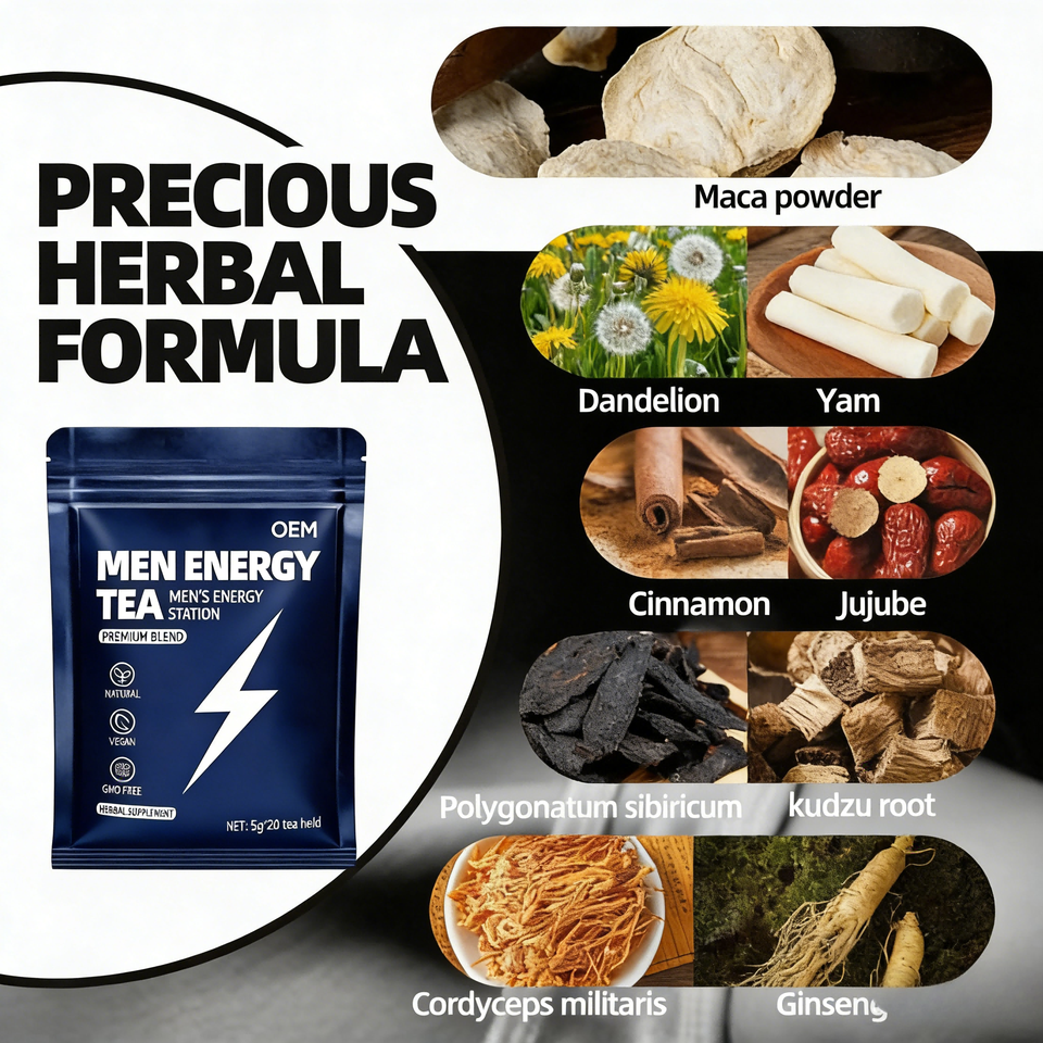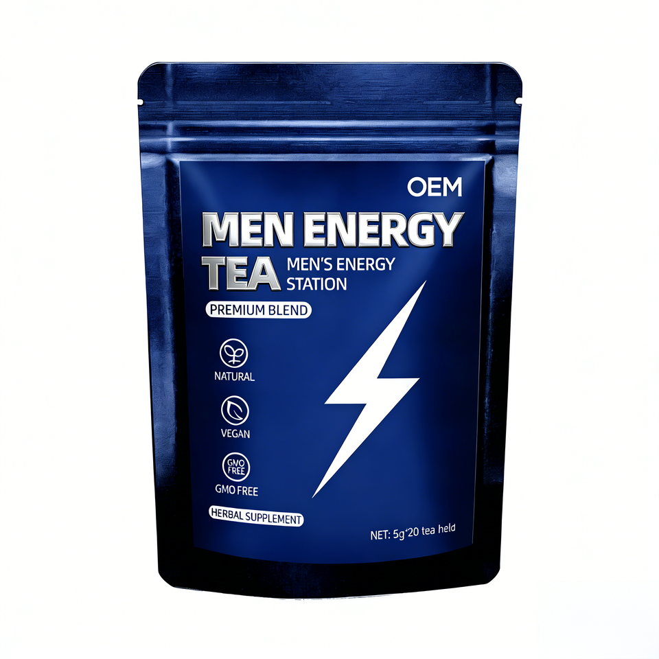 ชาเพิ่มพลังสำหรับผู้ชาย OEM ผสมสมุนไพรมาคา โสม ถั่งเช่า ออร์แกนิค วีแกน 20 ซองชา ซองละ 5 กรัม บรรจุกล่องพรีเมียมเพื่อเสริมพลังงาน