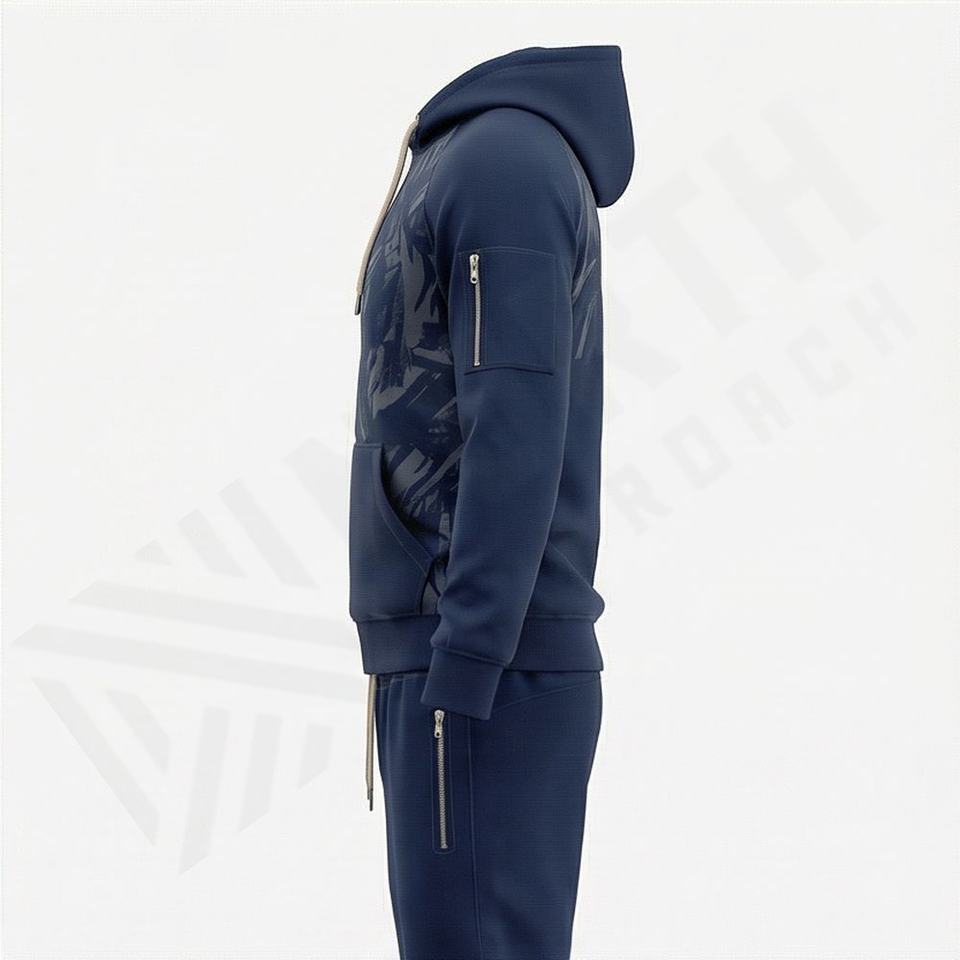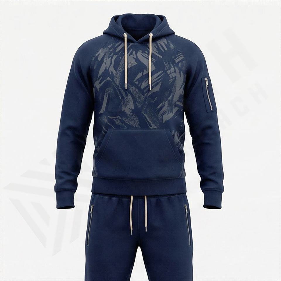 ชุดออกกำลังกายผู้ชาย OEM เสื้อฮู้ดแขนยาว กางเกงจ็อกเกอร์ ชุดวิ่ง ผ้าฟลีซระบายอากาศ ชุดกีฬาสองชิ้น