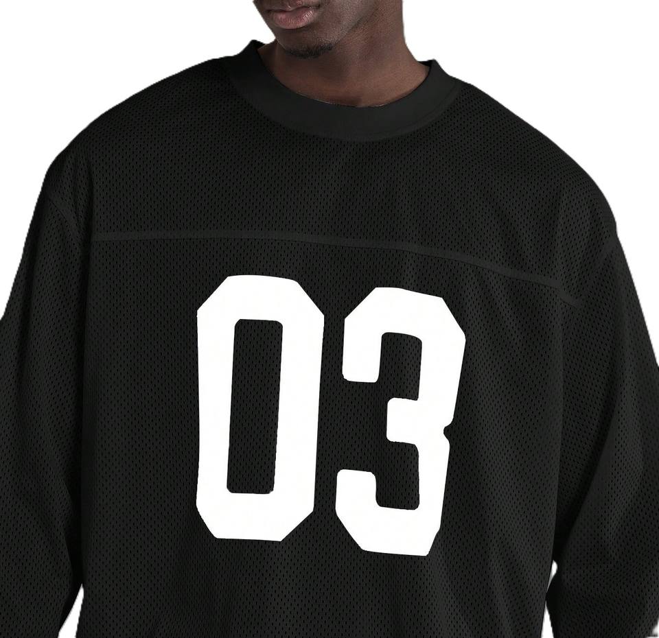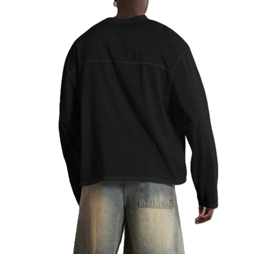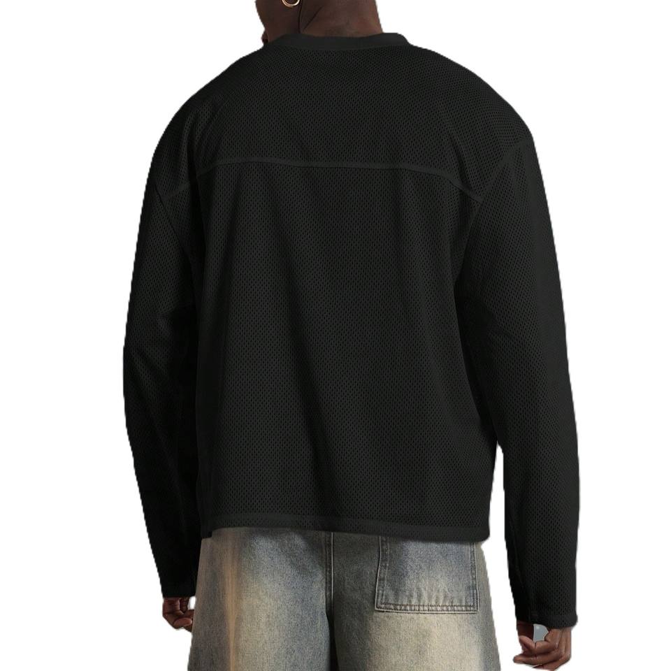 เสื้อฟุตบอลอเมริกันแขนยาวสำหรับผู้ชาย OEM ผ้าตาข่าย คอทรงโอ 240GSM โพลีเอสเตอร์ ทรงโอเวอร์ไซส์ ไหล่ตก สไตล์สตรีทแวร์