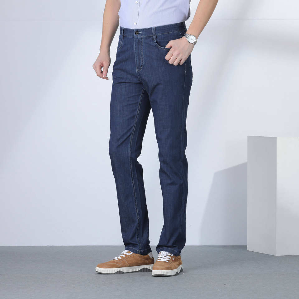 กางเกงยีนส์ผู้ชายทรงแบ็กกี้ฟอกสีวินเทจ, กางเกงยีนส์ขาตรงสีน้ำเงินเข้มระบายอากาศได้และกันน้ำผ้าฝ้าย100%