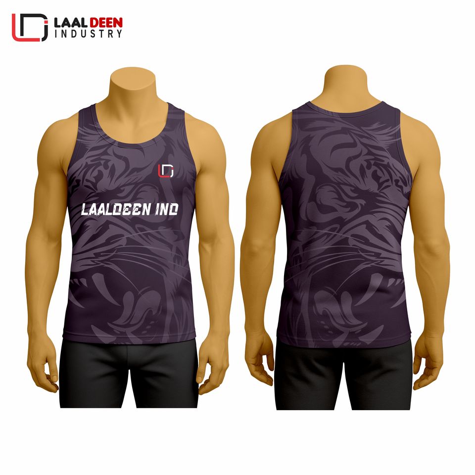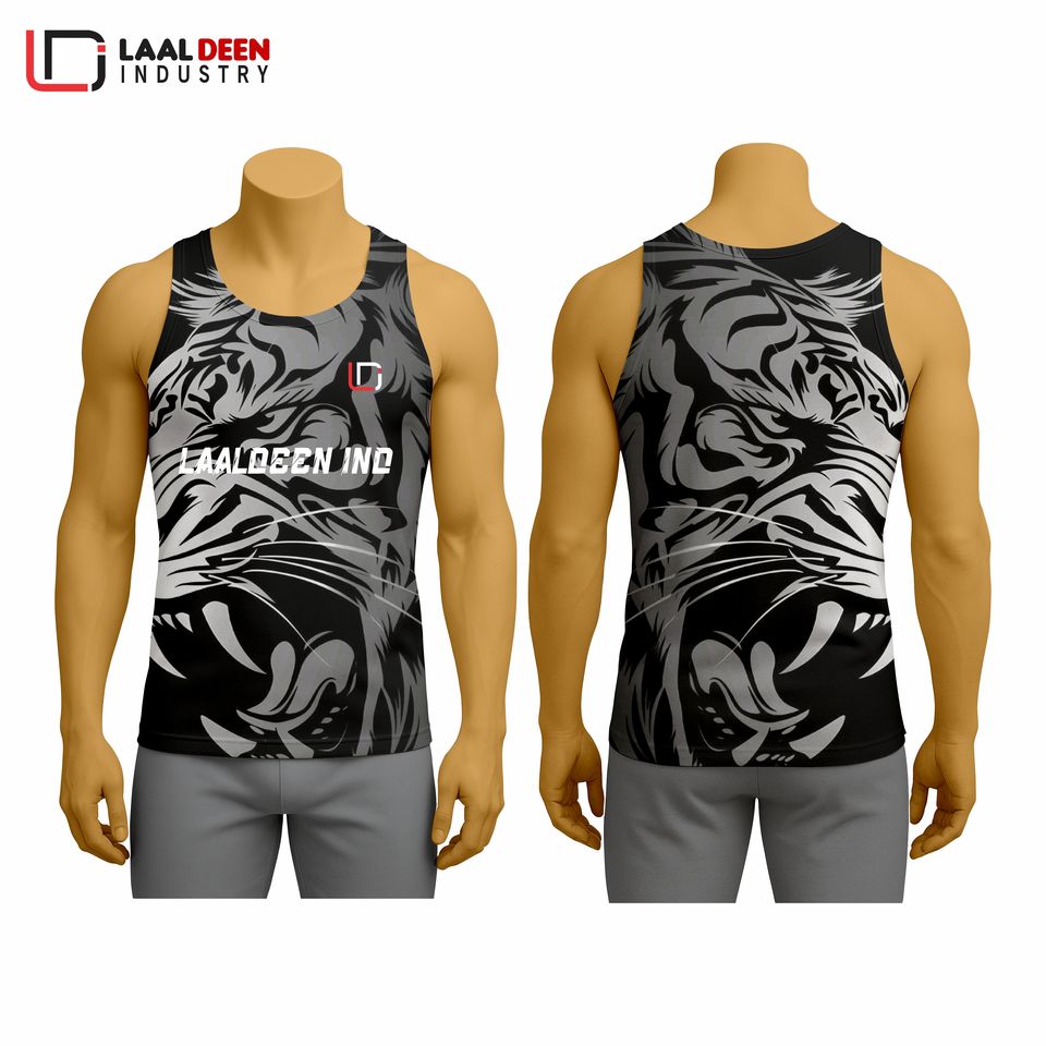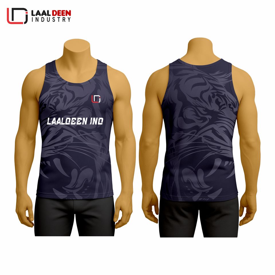 เสื้อกล้ามผู้ชายผ้าโพลีเอสเตอร์/ ผ้าฝ้ายถักระบายอากาศได้ดีมีโลโก้ด้านหน้าและด้านหลังสำหรับยิมและออกกำลังกาย