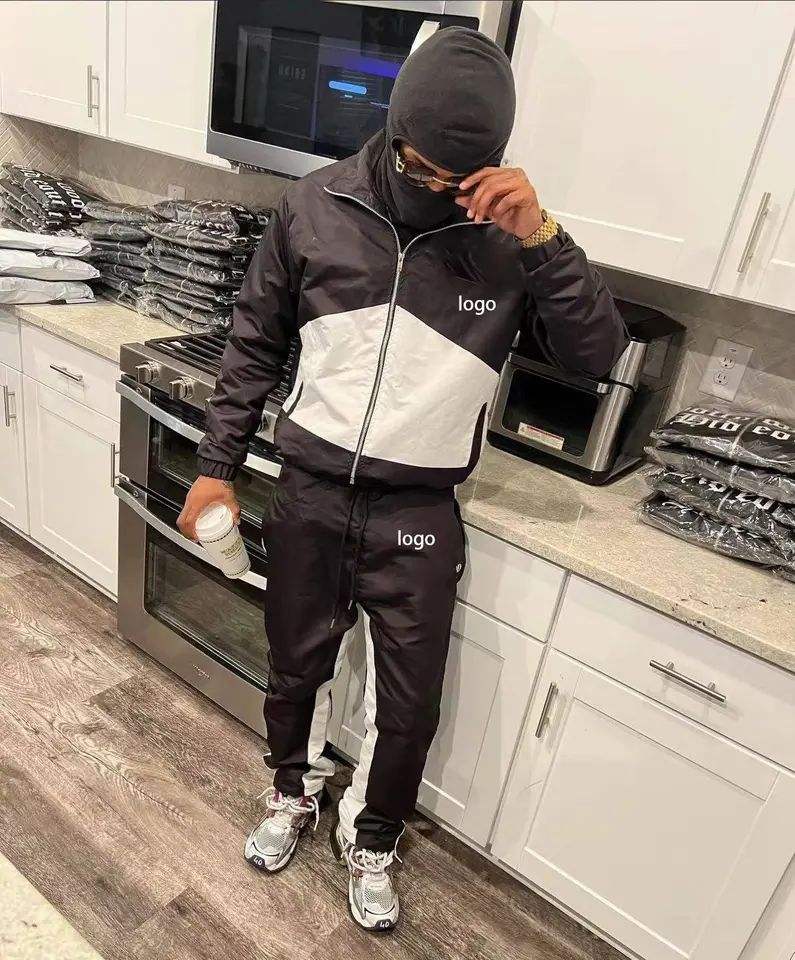 ชุดเสื้อแจ็คเก็ตผ้าไนลอนคอปกและซิปสำหรับผู้ชายชุดวอร์มสองชิ้นชุดกันลมชุดวอร์มกางเกงวิ่ง
