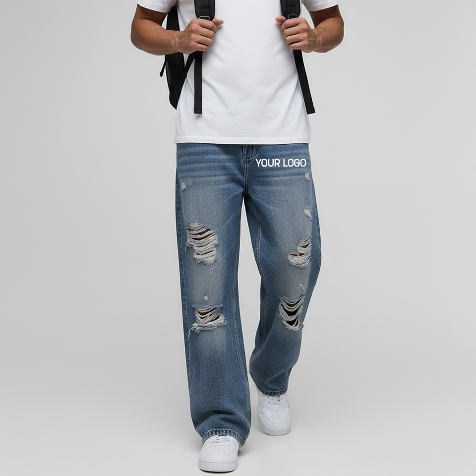 กางเกงยีนส์เดนิมทรงขากว้างสำหรับผู้ชาย แต่งขาด ดีไซน์เอวสูง ลุคสตรีทแวร์ ปักลาย ล้างสีแบบดิสเทรส