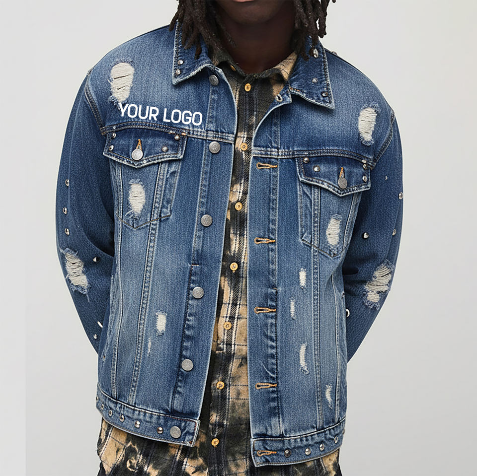 OEM Men's Vintage Distressed Denim Jacket Ripped Front Button Closure Regular Fit 4 Pockets Waterproof Wool Lined Blue Washed