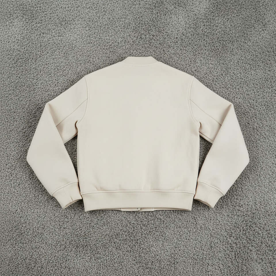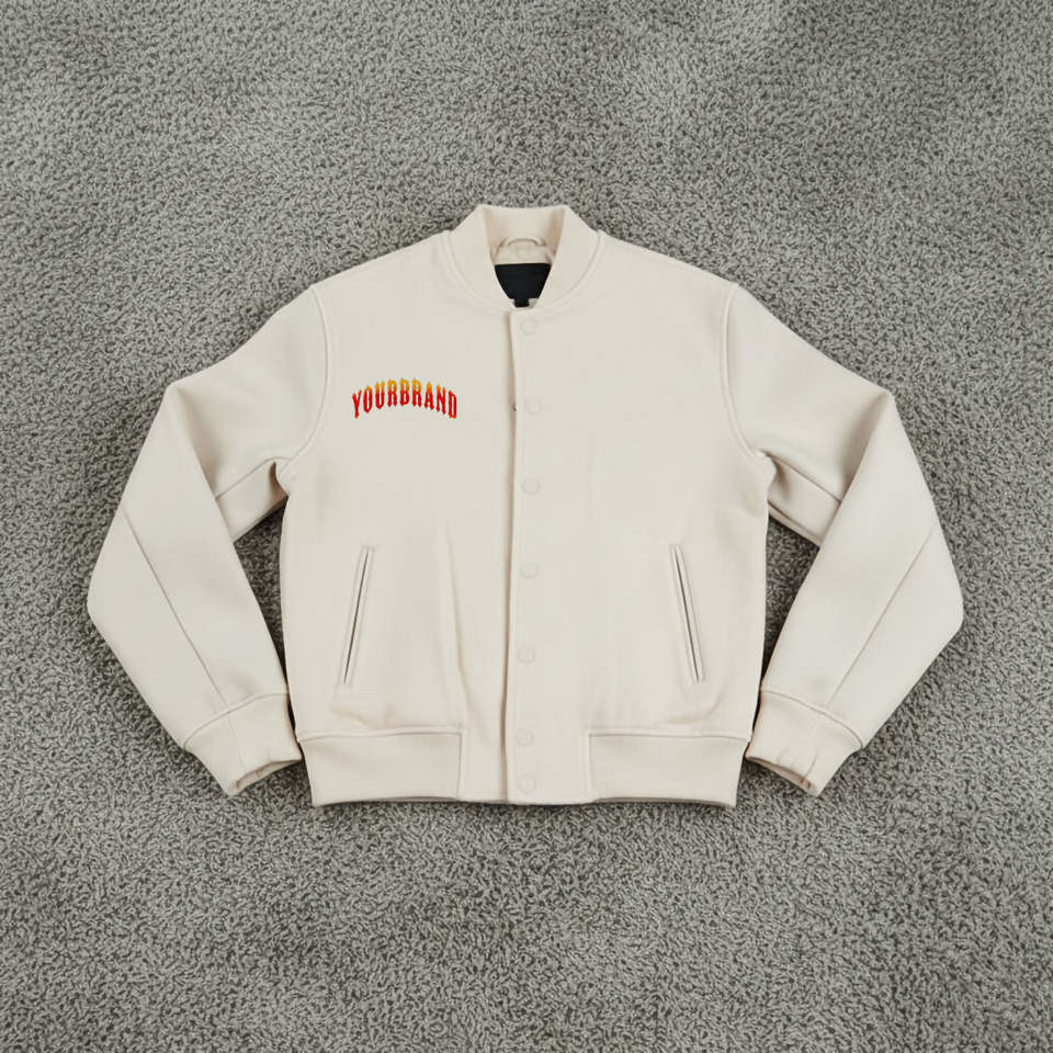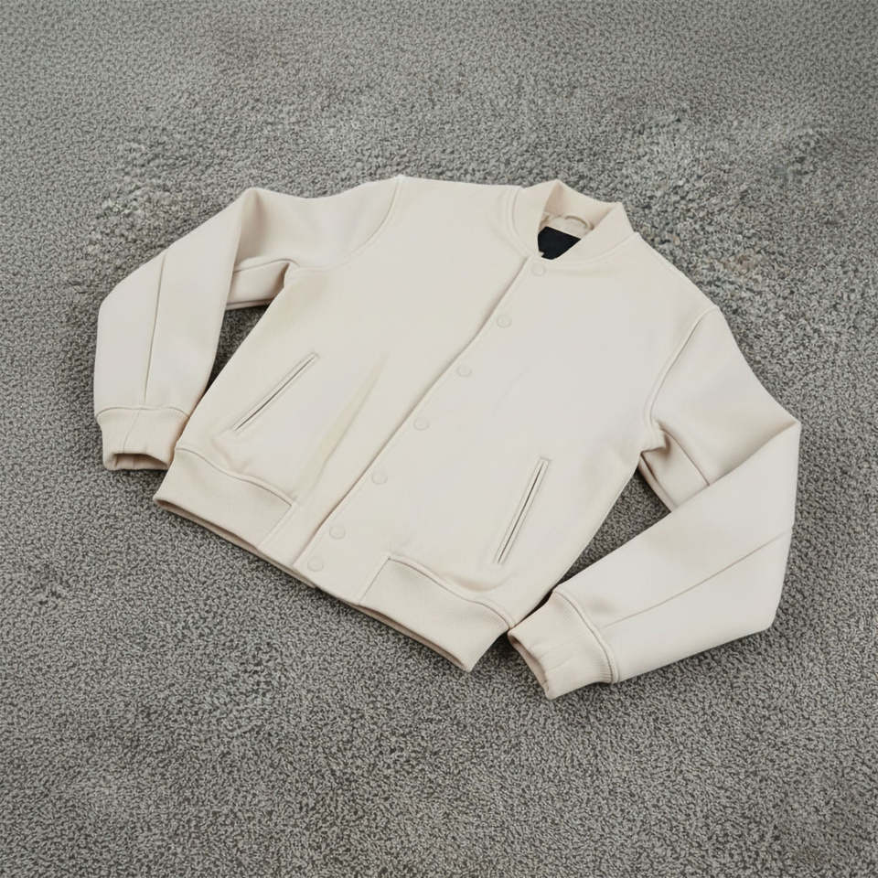 แจ็คเก็ตวาร์ซิตี้สีเบจอ่อนสำหรับผู้ชาย OEM ผ้าฝ้าย 100% แขนหนังแท้ คอริบ ระบายอากาศได้ดี เหมาะสำหรับฤดูหนาว