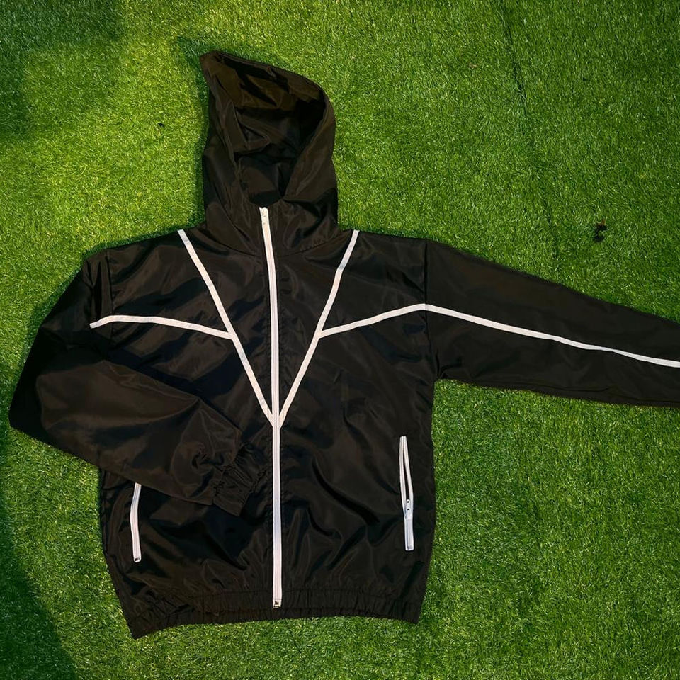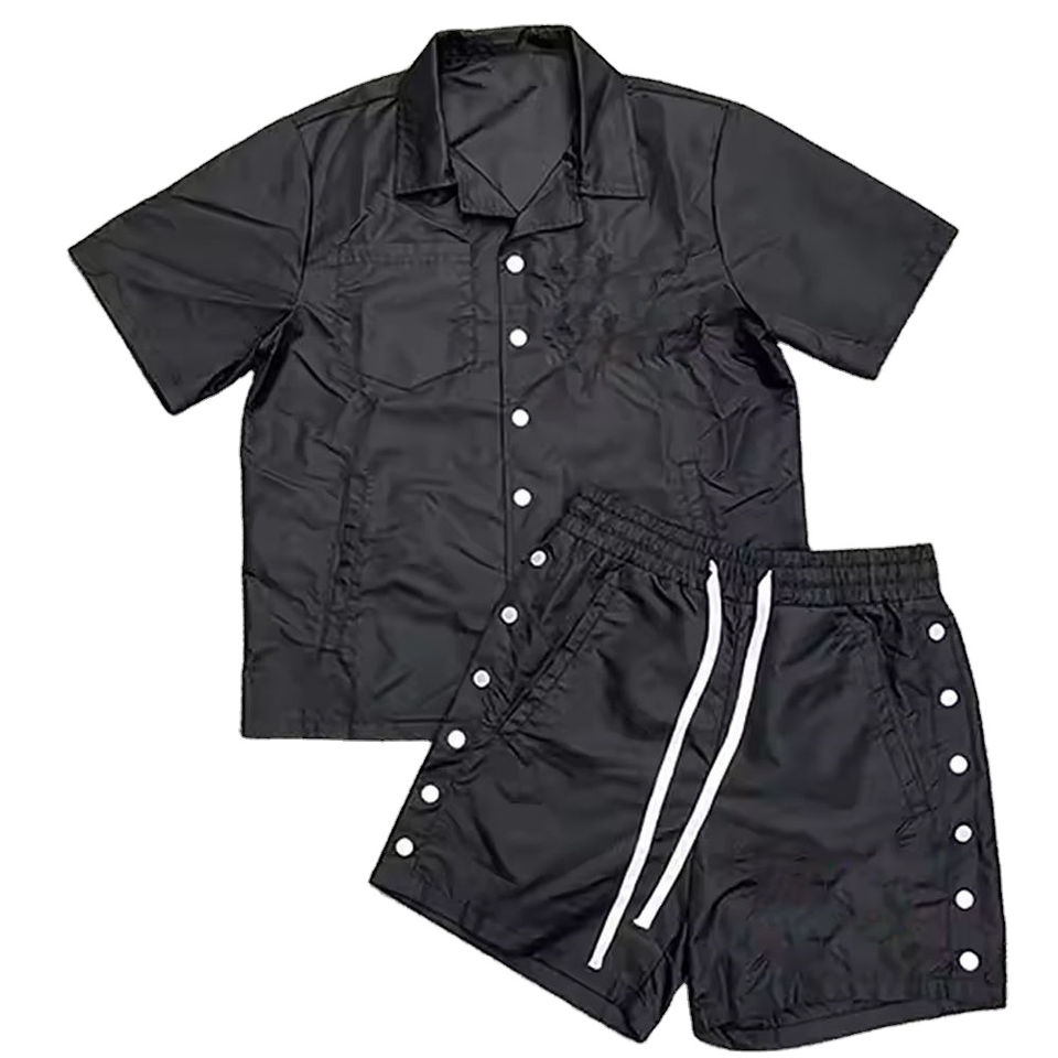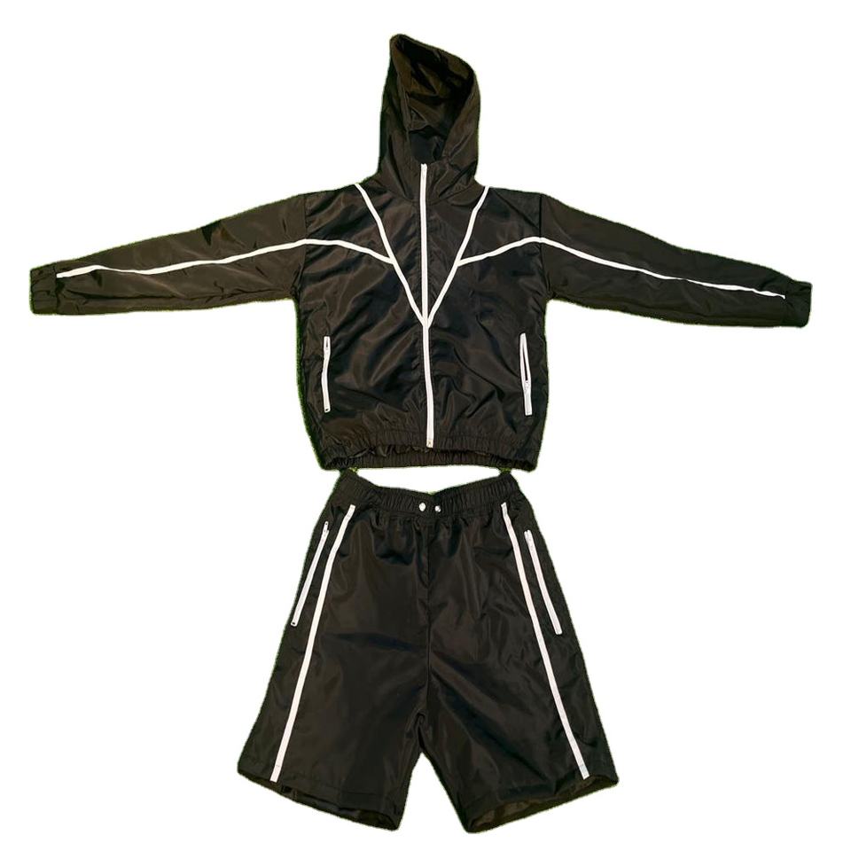 ชุดวอร์มผู้ชาย OEM สำหรับฤดูร้อน สไตล์ฮิปฮอป เสื้อแจ็คเก็ตและกางเกงขาสั้นแบบมีซิปสะท้อนแสง ผลิตตามสั่ง ผ้าโพลีเอสเตอร์ 100% ชุดสองชิ้น