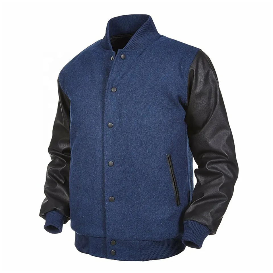 แจ็คเก็ตวาร์ซิตี้ผู้ชายแบบ OEM แขนหนังผสมขนสัตว์ ปักโลโก้ตามสั่ง สไตล์เบสบอล