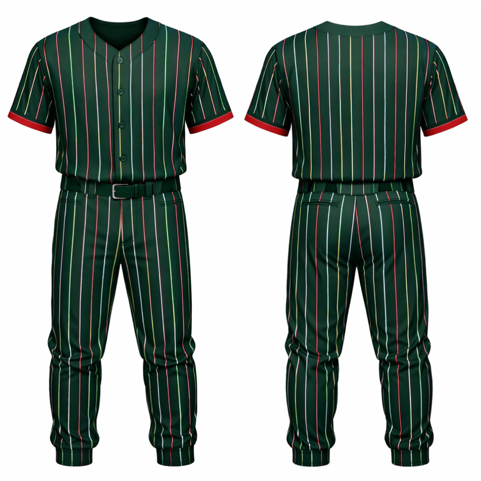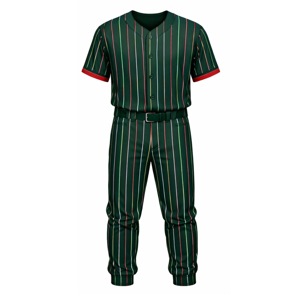 ชุดยูนิฟอร์มเบสบอลแบบซับลิเมชั่นสำหรับผู้ชาย OEM สีเขียวป่าลายทางหลากสีพร้อมแถบสีแดงที่แขนเสื้อและกางเกงเข้าชุด