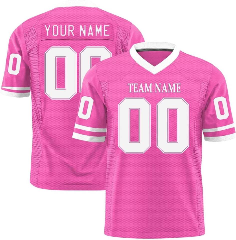 เสื้อฟุตบอลอเมริกันแบบแห้งเร็วผ้าโพลีเอสเตอร์แบบแห้งเร็วพิมพ์โลโก้ทีมหมายเลขขนาดพิเศษแขนเสื้อลาย