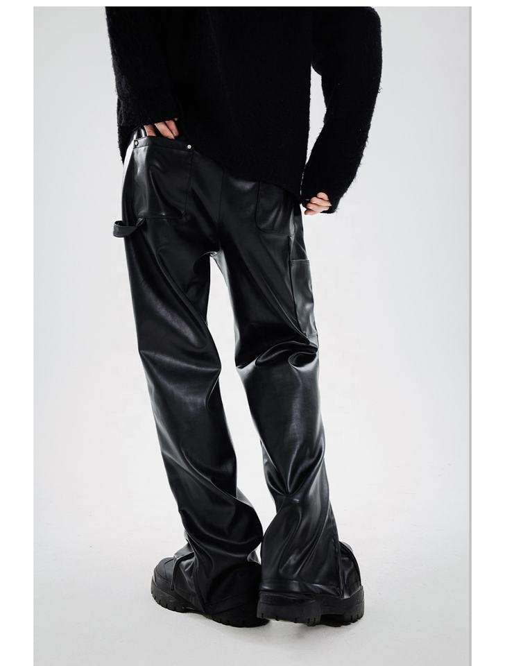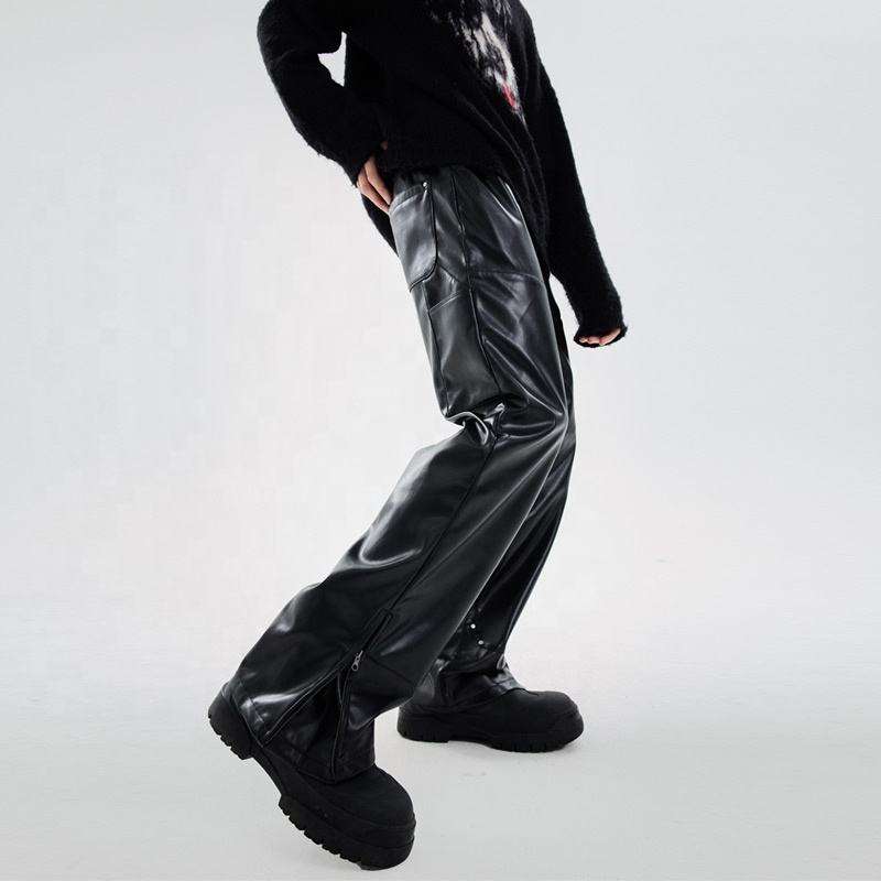 กางเกงยีนส์ผู้ชายเอวกลางทรง OEM ดีไซน์โดดเด่น สไตล์สตรีทแวร์ แต่งหนัง PU ทรงขาบาน ผลิตด้วยวิธีการทอผ้าแบบไม่ถักทอ สินค้าใหม่ล่าสุด
