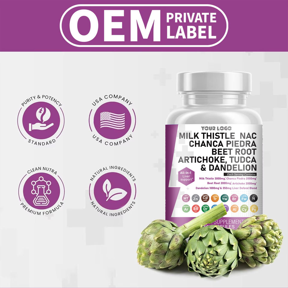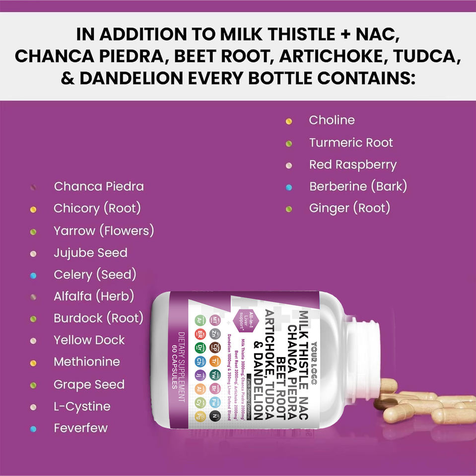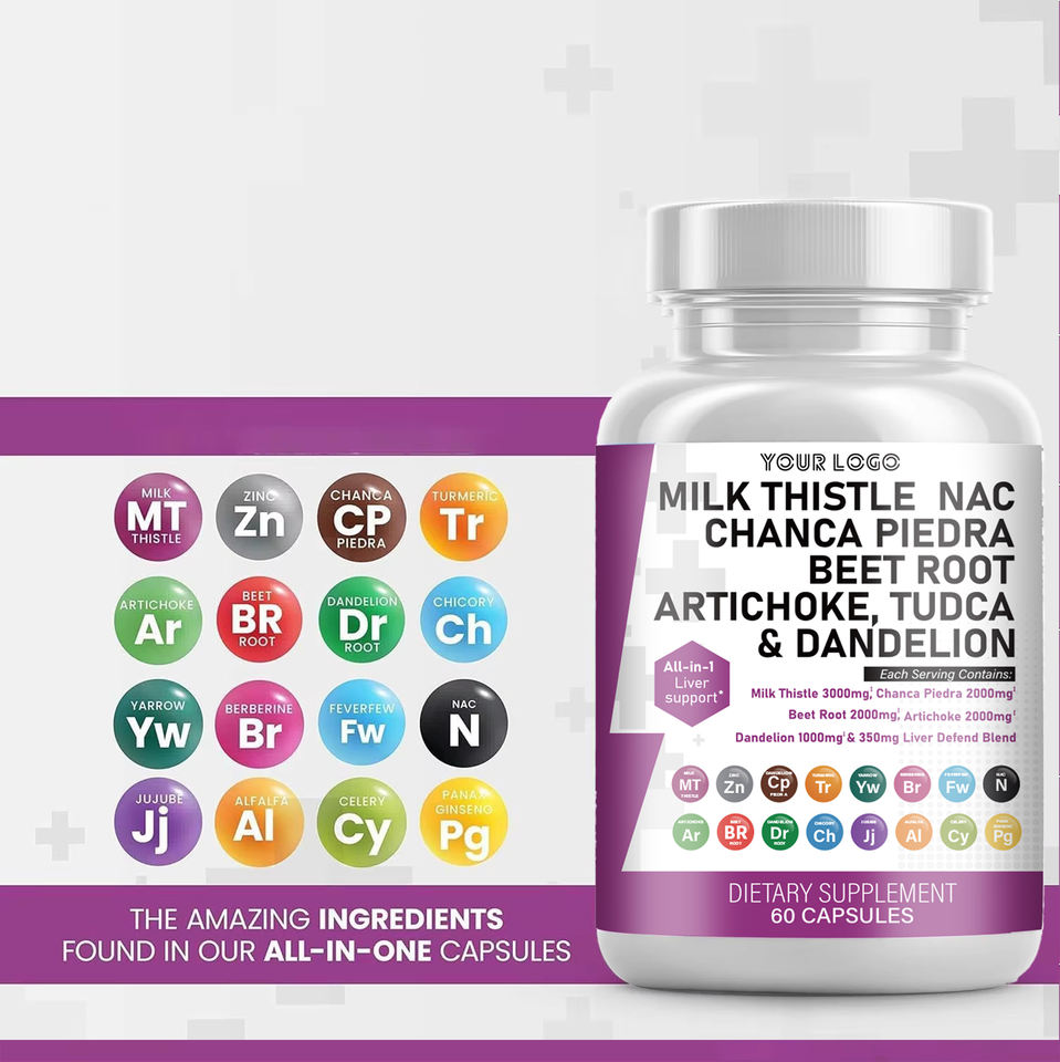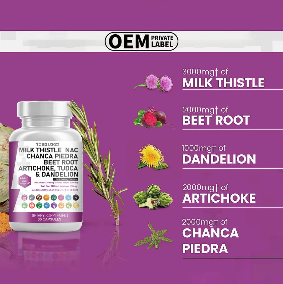 แคปซูลสมุนไพร OEM มิลค์ธิสเทิล คอมเพล็กซ์ สำหรับดีท็อกซ์ตับและบำรุงผิว ช่วยบำรุงตับ 60 แคปซูล