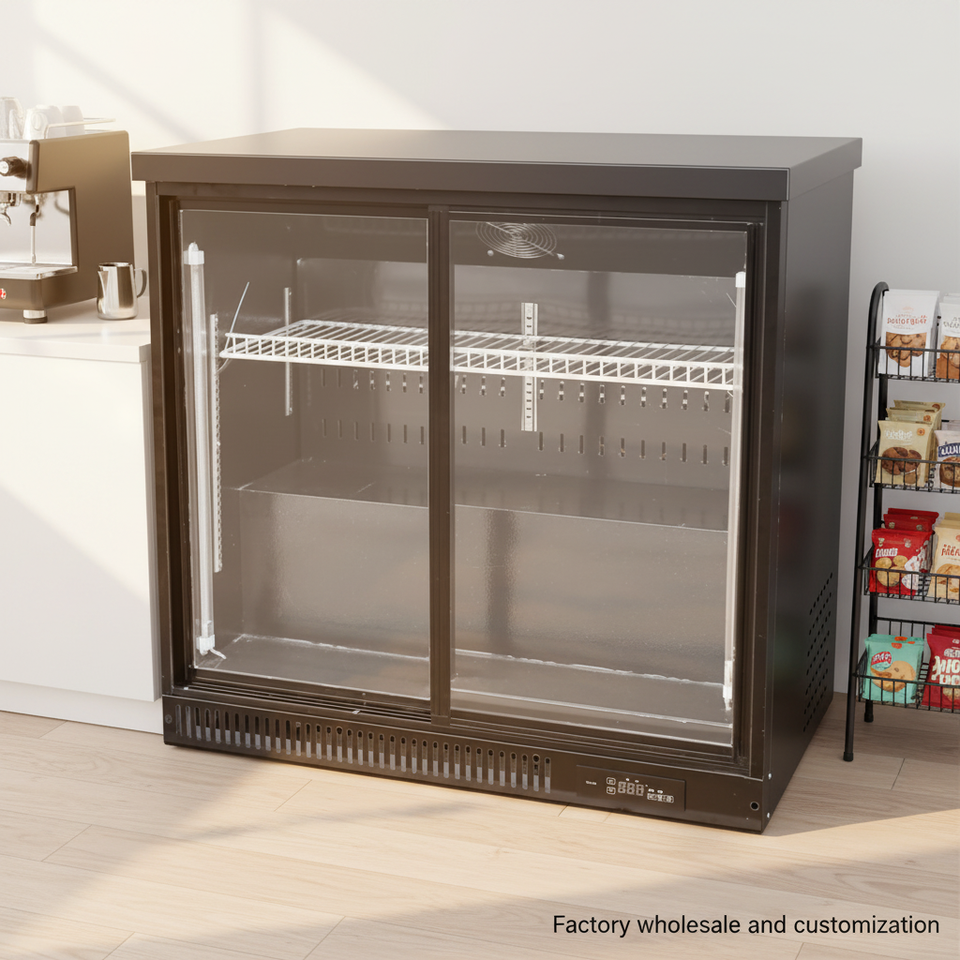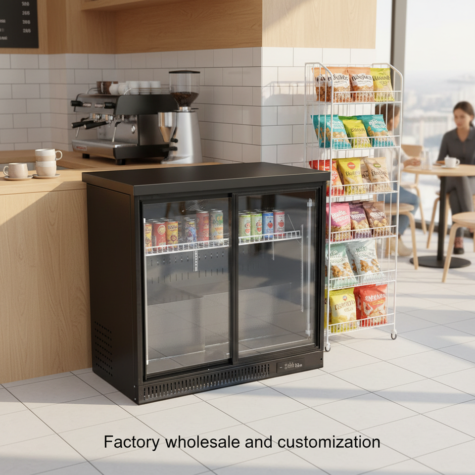 ตู้แช่เครื่องดื่มแบบแสดงสินค้าเชิงพาณิชย์ทันสมัยจากโรงงานผู้ผลิต (OEM) ตู้เย็นบาร์แบบประตูกระจกสองบานสำหรับเก็บเครื่องดื่ม