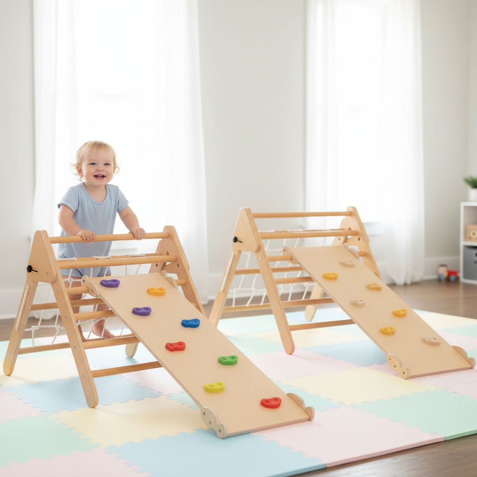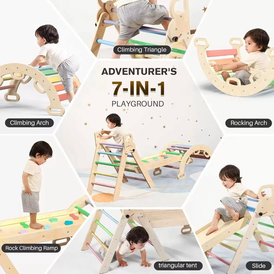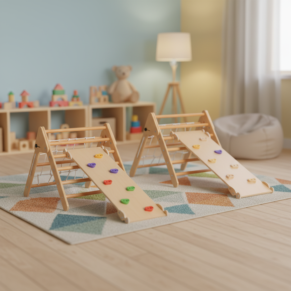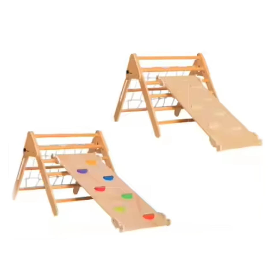 ชุดโครงปีนป่ายติดผนังไม้สำหรับเด็ก แรงบันดาลใจจากมอนเตสซอรี่ แบบนุ่มนวล เป็นมิตรกับสิ่งแวดล้อม รูปทรงสามเหลี่ยมพิคเลอร์ สำหรับเด็กวัยเตาะแตะ โรงเรียนอนุบาล