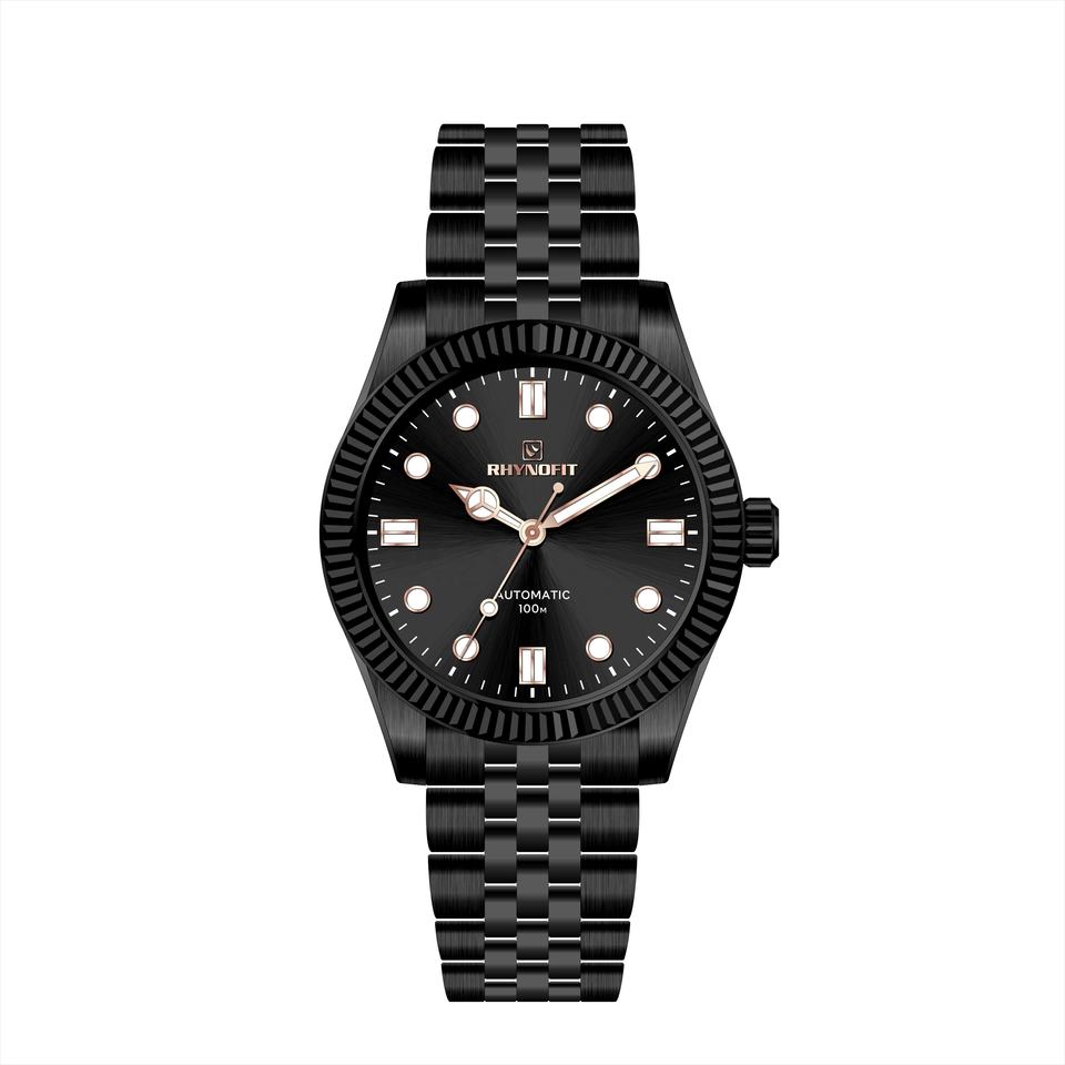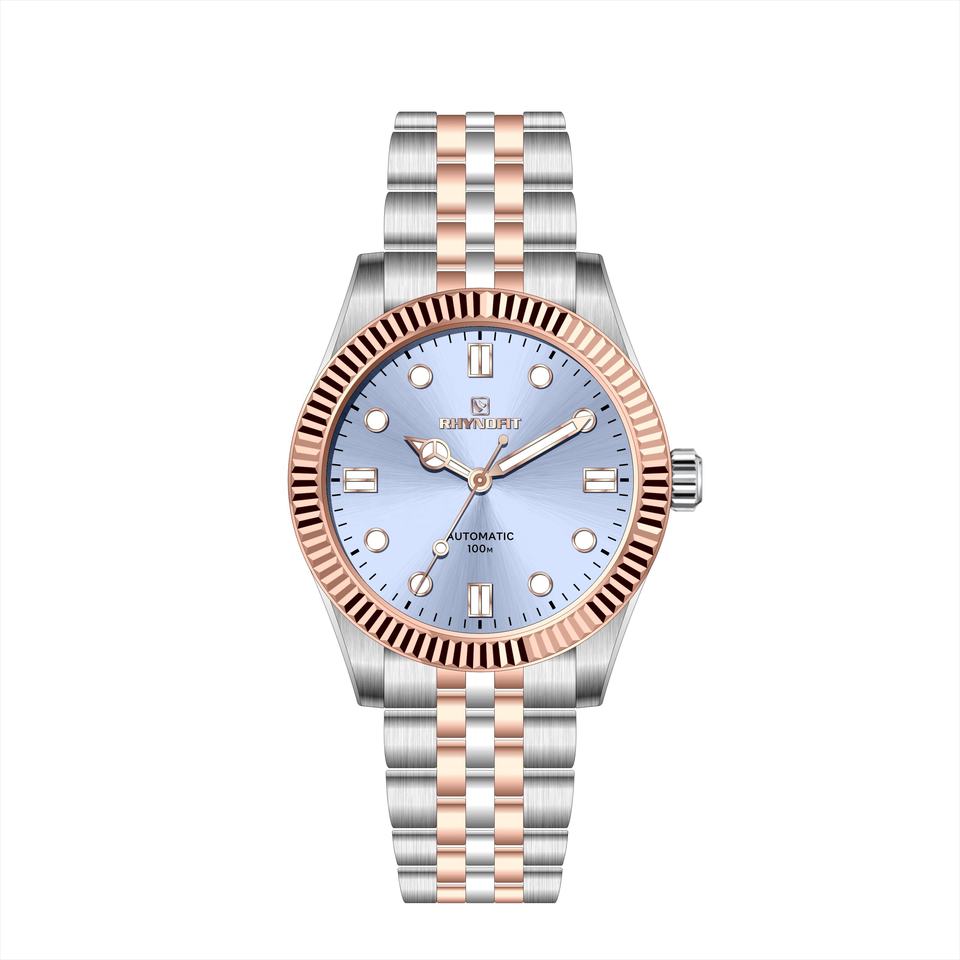 นาฬิกาข้อมือผู้ชาย OEM หน้าปัดมุก ขอบหน้าปัดแบบร่อง ตัวเรือนสแตนเลสสตีล 316L สีเงินทูโทน พร้อมกลไกอัตโนมัติ 8215