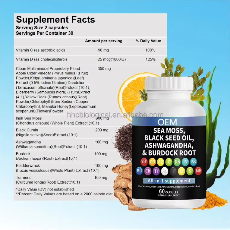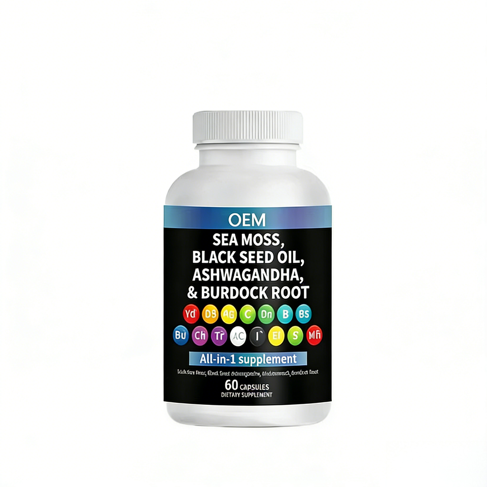 แคปซูลซูเปอร์ฟู้ด OEM สูตรผสมพิเศษ สาหร่ายทะเล อัชวาคานธา น้ำมันเมล็ดดำ ขมิ้น ผลิตภัณฑ์เสริมอาหารฉลากส่วนตัว สารต้านอนุมูลอิสระ เสริมภูมิคุ้มกัน