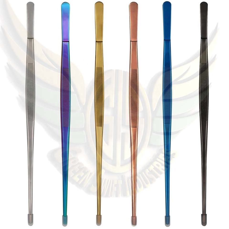 คีมคีบสแตนเลสสำหรับเชฟที่มีมุมแบบใหม่อุปกรณ์สำหรับทำอาหารจากอุตสาหกรรมที่รวดเร็วสีเขียว