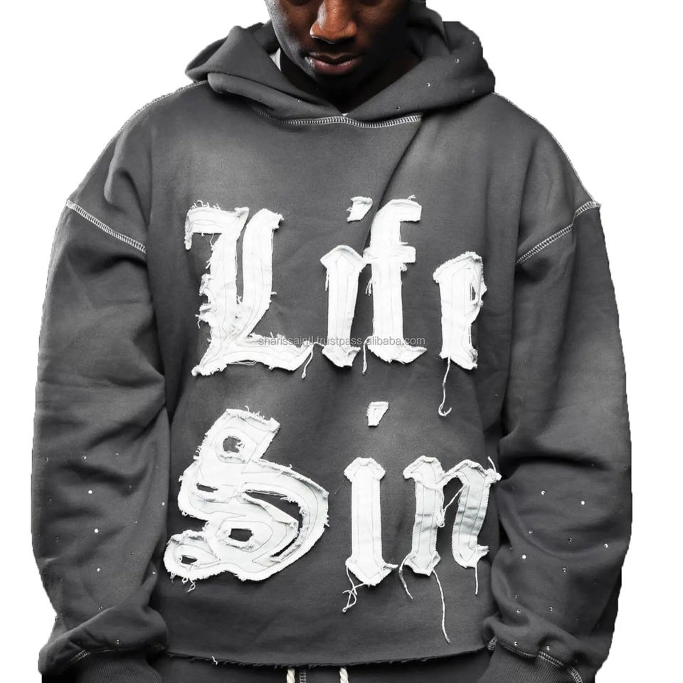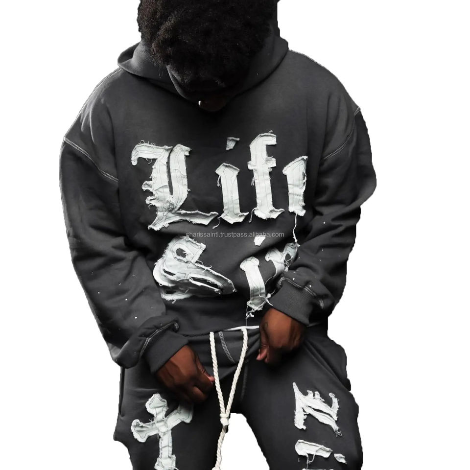 ชุดสเวตสูทผ้าฝ้ายเนื้อหนาปักลายใหม่สไตล์ OEM พร้อมฮู้ดปักลายแบบดิสเทรสสำหรับผู้ชาย