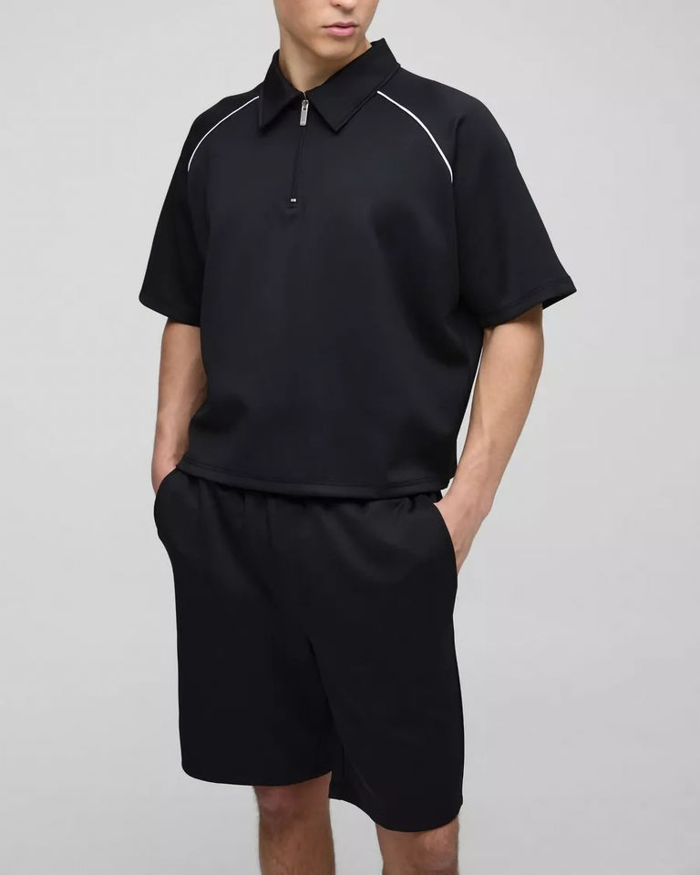 ชุดเซ็ต 2 ชิ้นสำหรับผู้ชาย OEM/ODM ผ้าฝ้าย 100% เสื้อโปโลทรงหลวม กางเกงขาสั้น พร้อมสกรีนโลโก้ตามสั่ง ผ้าไหมพิมพ์ลาย ชุดออกกำลังกายสีพื้น ความยาวระดับเข่า