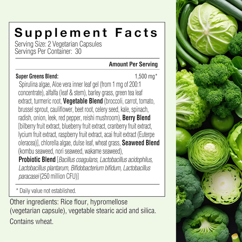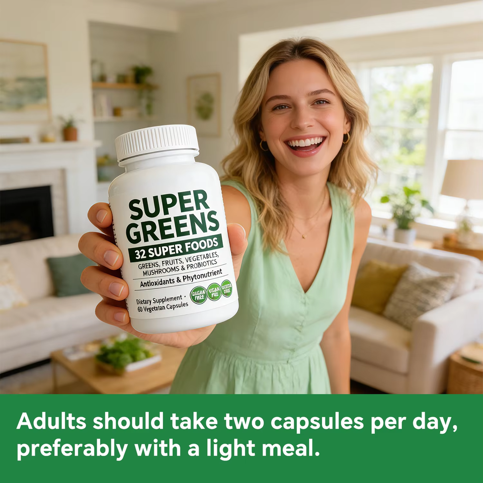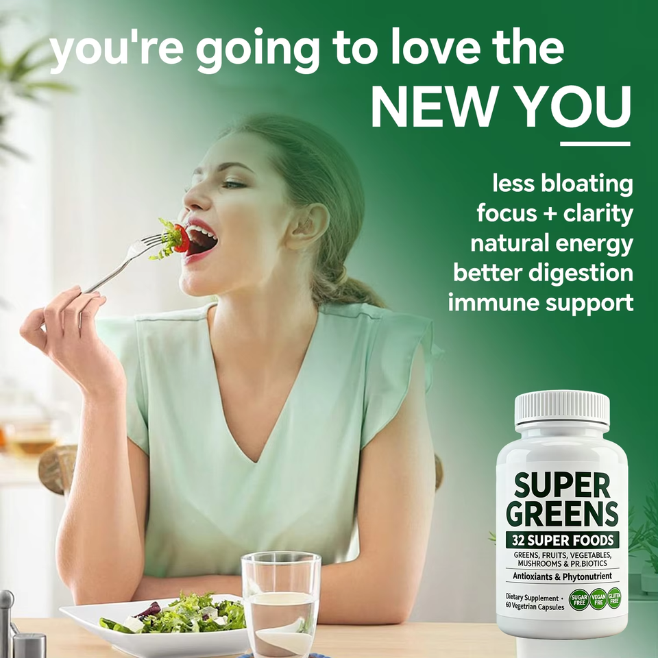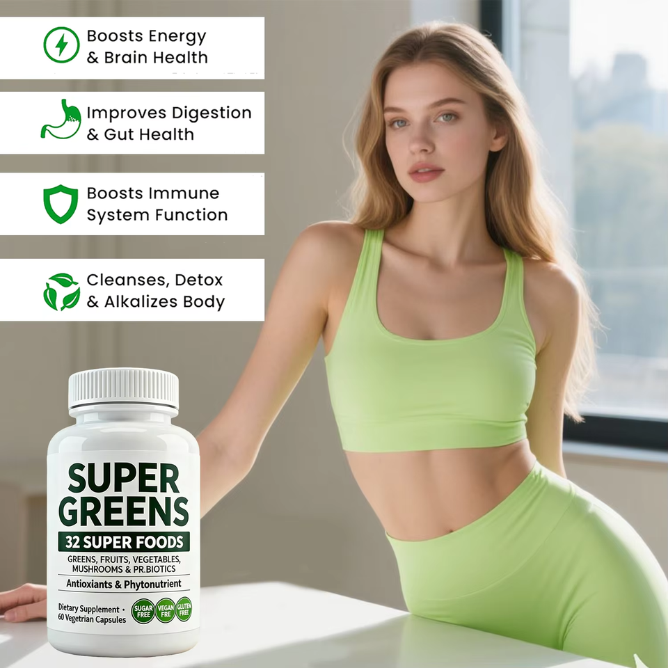 OEM ODM 32 ซูเปอร์กรีนส์ คอมเพล็กซ์ แคปซูล 60 เม็ด ผลิตภัณฑ์ผสมจากอาหารธรรมชาติ พร้อมโปรไบโอติกส์ มังสวิรัติ ปราศจากกลูเตน อาหารเสริม